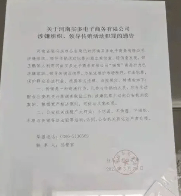 2021年3月29日,駐馬店市公安局發(fā)布“關于河南買多電子商務有限公司涉嫌組織、領導傳銷活動犯罪的通告”稱:公安機關經立案偵查,邵玉鵬等人利用河南買多電子商務有限公司“銷售”商品行為已涉嫌組織、領導傳銷活動罪。傳銷是一種違法行為,凡參與傳銷人員,應主動配合公安機關開展調查取證工作,涉嫌犯罪主動向公安機關投案的,根據寬嚴相濟原則,可依法從寬處理。