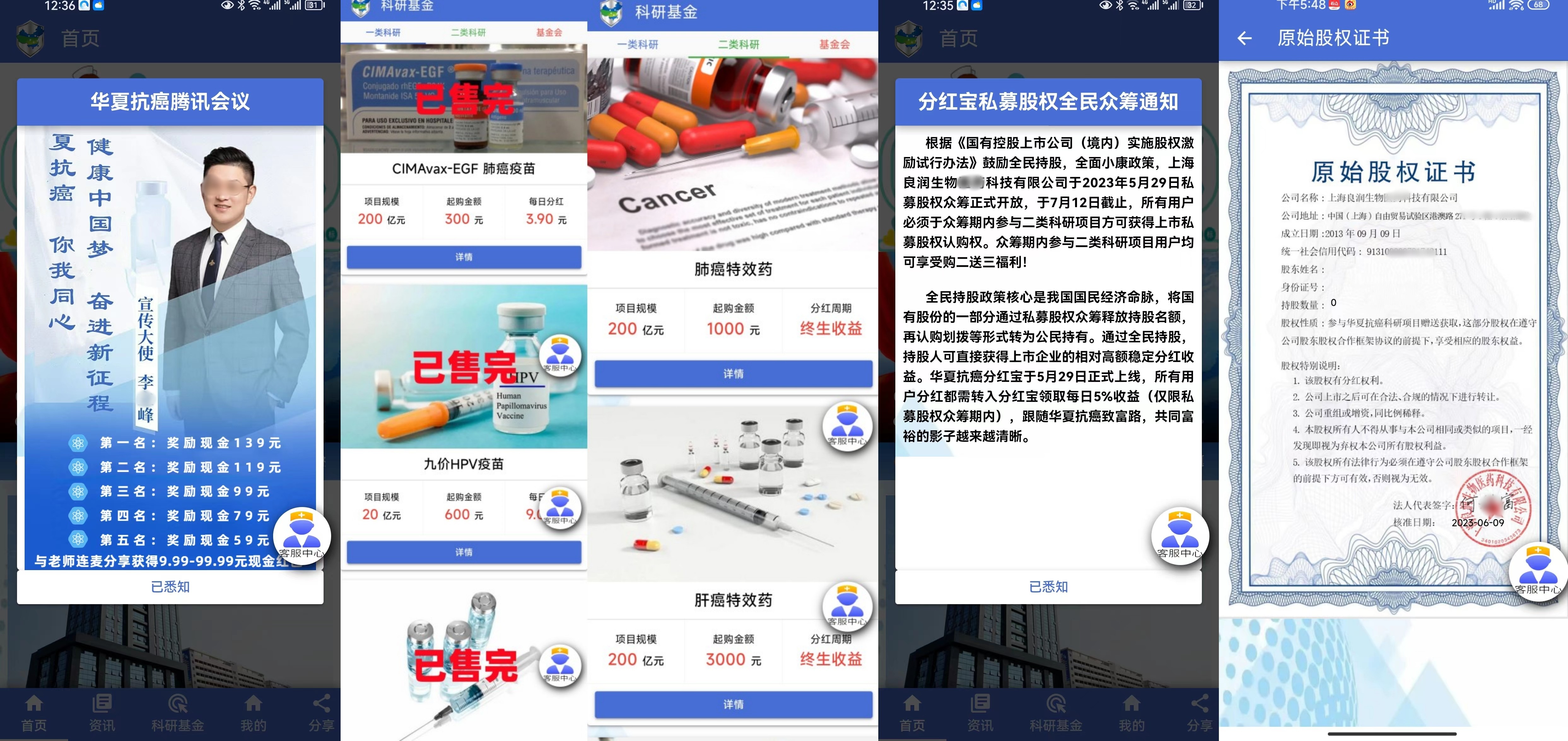 六、“華夏抗癌APP”:冒充“上海良潤生物醫(yī)藥科技有限公司”,打著私募股權眾籌、投資原始股權、全民持股的旗號,以認購產品,到期給高額分紅為名實施詐騙。收款賬戶每天都在變