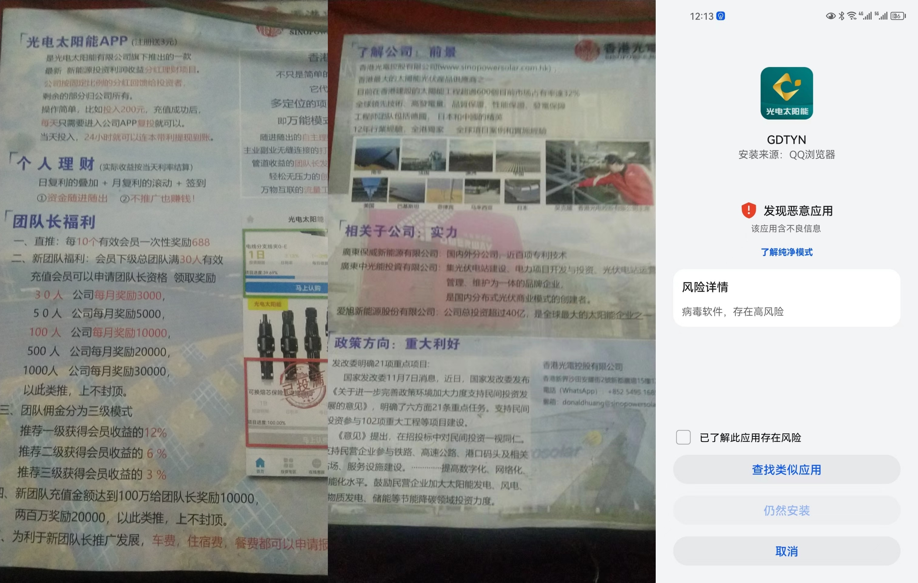 七、“小米汽車APP”:冒充“小米汽車有限公司”,打著股權投資的名義,小投資定期可獲得高額分紅為名實施詐騙。 八、“光電太陽能APP”:冒充“香港光電控股有限公司”,打著短期投資獲得高額利息為名實施詐騙,目前該APP已經無法正常打開。