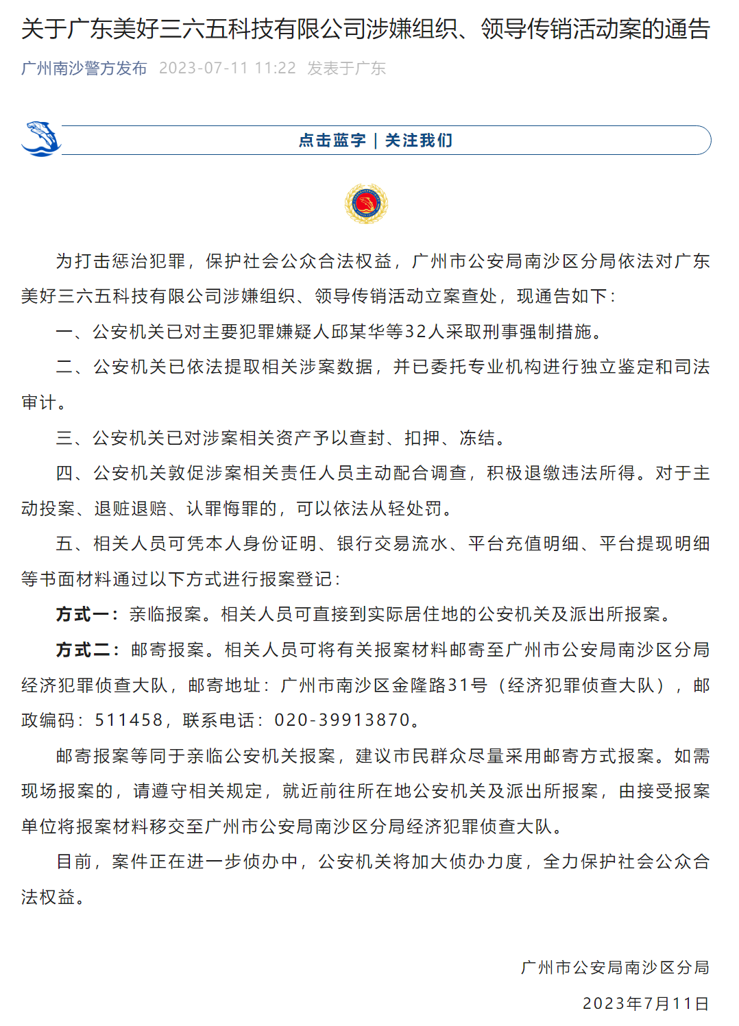 發(fā)表時(shí)間:2023-07-11 15:42作者:廣州南沙警方來(lái)源:廣州南沙警方 為打擊懲治犯罪,保護(hù)社會(huì)公眾合法權(quán)益,廣州市公安局南沙區(qū)分局依法對(duì)廣東美好三六五科技有限公司涉嫌組織、領(lǐng)導(dǎo)傳銷(xiāo)活動(dòng)立案查處,現(xiàn)通告如下: 一、公安機(jī)關(guān)已對(duì)主要犯罪嫌疑人邱某華等32人采取刑事強(qiáng)制措施。 二、公安機(jī)關(guān)已依法提取相關(guān)涉案數(shù)據(jù),并已委托專(zhuān)業(yè)機(jī)構(gòu)進(jìn)行獨(dú)立鑒定和司法審計(jì)。 三、公安機(jī)關(guān)已對(duì)涉案相關(guān)資產(chǎn)予以查封、扣押、凍結(jié)。 四、公安機(jī)關(guān)敦促涉案相關(guān)責(zé)任人員主動(dòng)配合調(diào)查,積極退繳違法所得。對(duì)于主動(dòng)投案、退贓退賠、認(rèn)罪悔罪的,可以依法從輕處罰。 五、相關(guān)人員可憑本人身份證明、銀行交易流水、平臺(tái)充值明細(xì)、平臺(tái)提現(xiàn)明細(xì)等書(shū)面材料通過(guò)以下方式進(jìn)行報(bào)案登記: 方式一:親臨報(bào)案。相關(guān)人員可直接到實(shí)際居住地的公安機(jī)關(guān)及派出所報(bào)案。 方式二:郵寄報(bào)案。相關(guān)人員可將有關(guān)報(bào)案材料郵寄至廣州市公安局南沙區(qū)分局經(jīng)濟(jì)犯罪偵查大隊(duì),郵寄地址:廣州市南沙區(qū)金隆路31號(hào)(經(jīng)濟(jì)犯罪偵查大隊(duì)),郵政編碼:511458。 郵寄報(bào)案等同于親臨公安機(jī)關(guān)報(bào)案,建議市民群眾盡量采用郵寄方式報(bào)案。如需現(xiàn)場(chǎng)報(bào)案的,請(qǐng)遵守相關(guān)規(guī)定,就近前往所在地公安機(jī)關(guān)及派出所報(bào)案,由接受報(bào)案單位將報(bào)案材料移交至廣州市公安局南沙區(qū)分局經(jīng)濟(jì)犯罪偵查大隊(duì)。 目前,案件正在進(jìn)一步偵辦中,公安機(jī)關(guān)將加大偵辦力度,全力保護(hù)社會(huì)公眾合法權(quán)益。 廣州市公安局南沙區(qū)分局 2023年7月11日