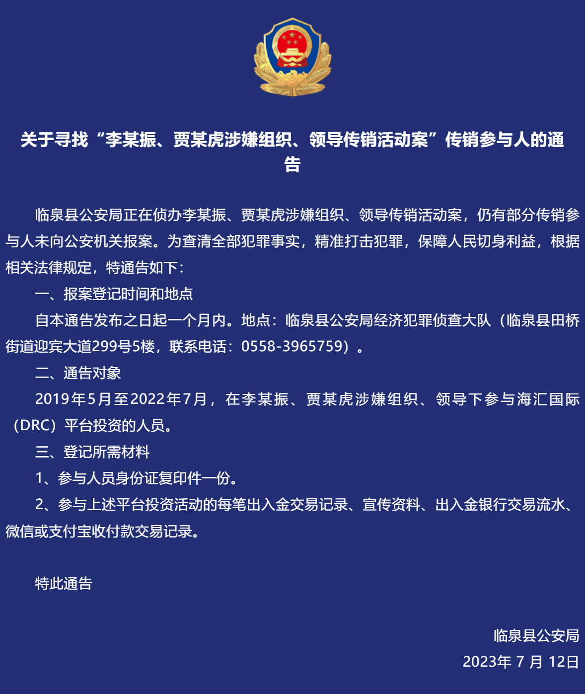 臨泉縣公安:參與海匯國(guó)際(DRC)傳銷案參與者請(qǐng)盡快報(bào)案