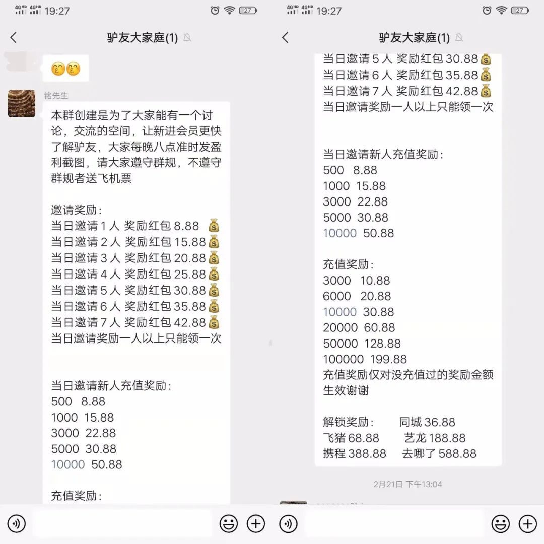 經(jīng)了解,原來(lái)周先生的妻子在網(wǎng)上看到了一個(gè)投資的廣告,便掃碼進(jìn)入了一個(gè)叫“驢友大家庭”的微信群。群里交流的內(nèi)容是在一個(gè)叫“驢友”的APP里充值,購(gòu)買虛擬的旅游產(chǎn)品。每天都能返現(xiàn),根據(jù)充值金額的多少,返現(xiàn)的比例不一樣,充的越多返的就越多,而且邀請(qǐng)好友還能返現(xiàn)。