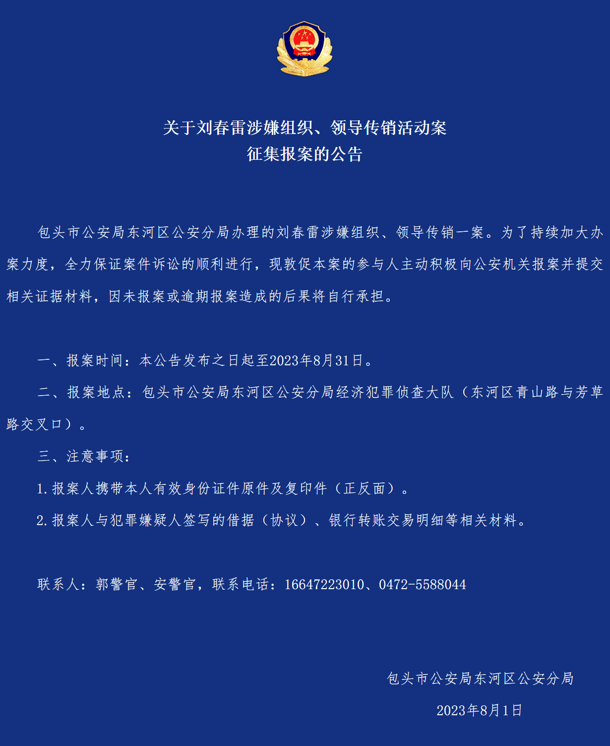 包頭警方:關(guān)于劉春雷涉嫌組織、領(lǐng)導(dǎo)傳銷活動案征集報案的公告