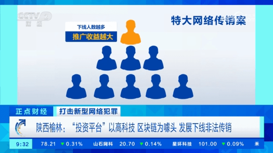 陜西省榆林市定邊縣公安局經(jīng)偵大隊辦案人員 夏春暉:(現(xiàn)在的網(wǎng)絡(luò)傳銷)摒棄了傳統(tǒng)傳銷洗腦式的模式,而是宣傳高科技、連接資本運作的口號,銷售所謂的股票、基金、期貨為誘餌,或者宣稱發(fā)售政府特大項目(投資額度),但是不開展任何經(jīng)營活動,完全以發(fā)展下線作為計酬、返利,體現(xiàn)的就是傳銷賺人頭費的模式。