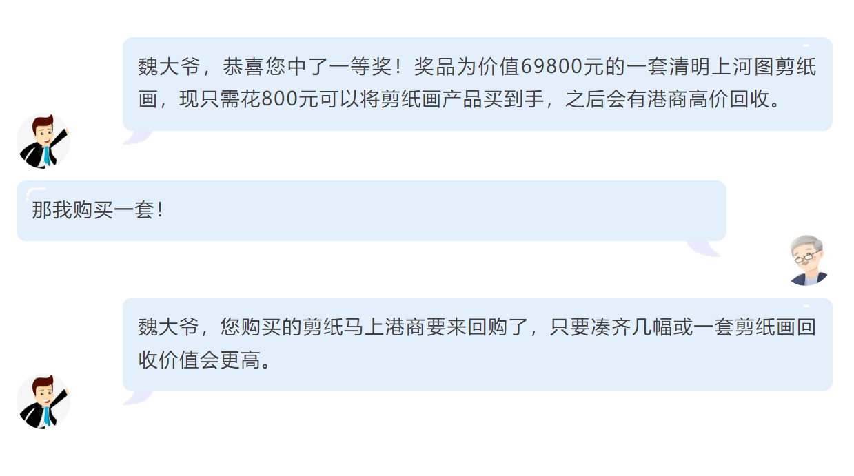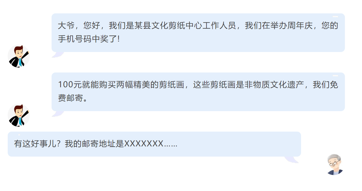 大爺,您好,我們是某縣文化剪紙中心工作人員,我們在舉辦周年慶,您的手機(jī)號碼中獎了!