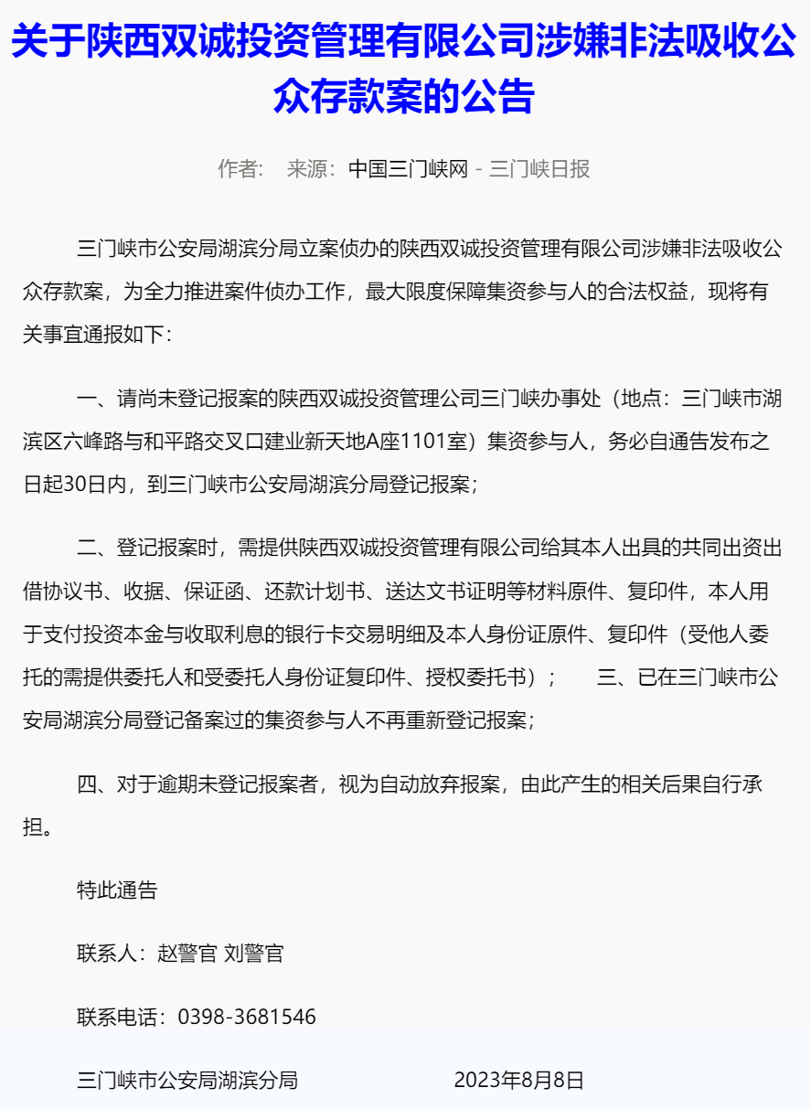 發(fā)表時(shí)間:2023-08-08 15:05作者:三門峽日?qǐng)?bào)來(lái)源:三門峽日?qǐng)?bào) 三門峽市公安局湖濱分局立案?jìng)赊k的陜西雙誠(chéng)投資管理有限公司涉嫌非法吸收公眾存款案,為全力推進(jìn)案件偵辦工作,最大限度保障集資參與人的合法權(quán)益,現(xiàn)將有關(guān)事宜通報(bào)如下: 一、請(qǐng)尚未登記報(bào)案的陜西雙誠(chéng)投資管理公司三門峽辦事處(地點(diǎn):三門峽市湖濱區(qū)六峰路與和平路交叉口建業(yè)新天地A座1101室)集資參與人,務(wù)必自通告發(fā)布之日起30日內(nèi),到三門峽市公安局湖濱分局登記報(bào)案; 二、登記報(bào)案時(shí),需提供陜西雙誠(chéng)投資管理有限公司給其本人出具的共同出資出借協(xié)議書、收據(jù)、保證函、還款計(jì)劃書、送達(dá)文書證明等材料原件、復(fù)印件,本人用于支付投資本金與收取利息的銀行卡交易明細(xì)及本人身份證原件、復(fù)印件(受他人委托的需提供委托人和受委托人身份證復(fù)印件、授權(quán)委托書); 三、已在三門峽市公安局湖濱分局登記備案過(guò)的集資參與人不再重新登記報(bào)案; 四、對(duì)于逾期未登記報(bào)案者,視為自動(dòng)放棄報(bào)案,由此產(chǎn)生的相關(guān)后果自行承擔(dān)。 特此通告 聯(lián)系人:趙警官 劉警官 三門峽市公安局湖濱分局 2023年8月8日