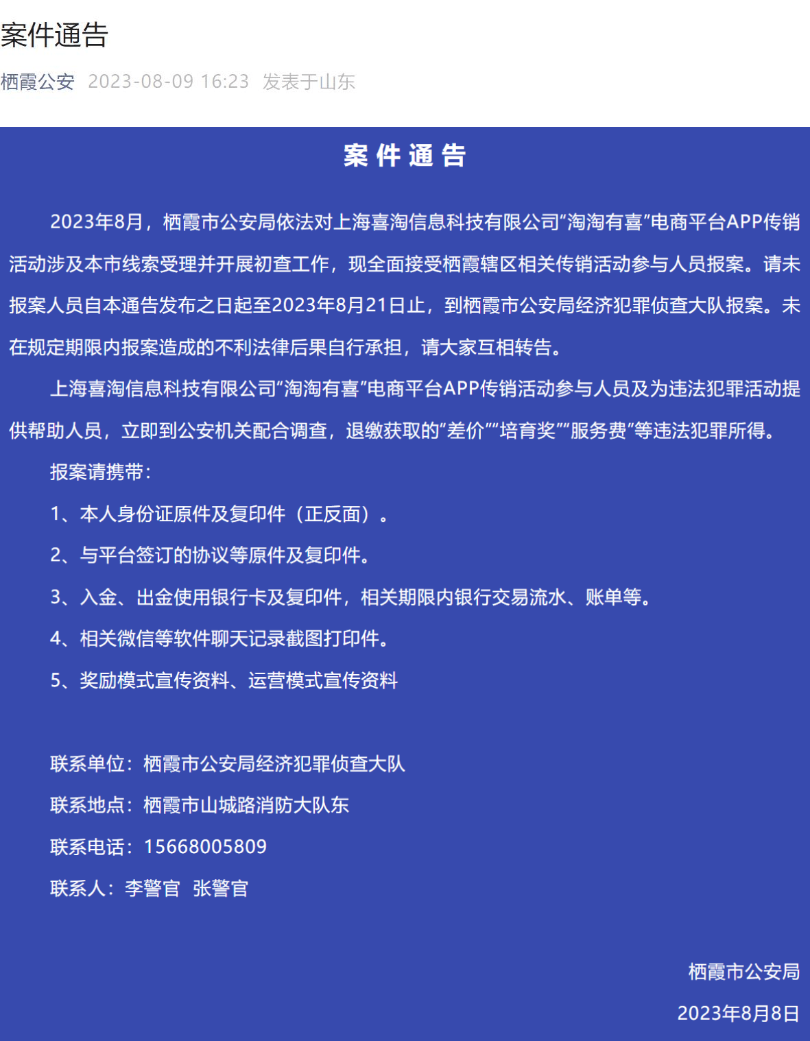 9日,李旭反傳防騙團(tuán)隊(duì)從棲霞公安獲悉,棲霞公安發(fā)布案件通告,請(qǐng)棲霞轄區(qū)參與“淘淘有喜”電商平臺(tái)的參與人員到棲霞市公安局經(jīng)濟(jì)犯罪偵查大隊(duì)報(bào)案。