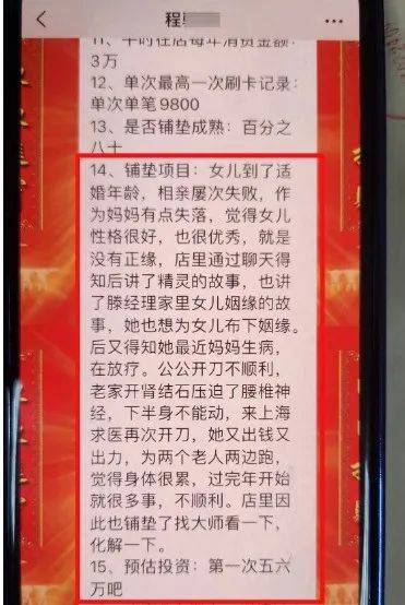 發(fā)表時間:2023-08-27 19:00作者:東方網(wǎng)、人民網(wǎng)上海來源:東方網(wǎng)、人民網(wǎng)上海 在上海全市發(fā)展30余家美容美發(fā)店作為引流渠道,盯上對風(fēng)水算命感興趣的“客戶”,精心收集整理他們的個人隱私信息,“一人一檔”提供給所謂“風(fēng)水大師”并精準(zhǔn)實施“算命調(diào)運”詐騙,有客戶被騙450多萬元人民幣…… 在今天上海市公安局舉行的新聞發(fā)布會上,警方通報搗毀一個以算命調(diào)運為幌子詐騙的犯罪團伙,抓獲犯罪嫌疑人25名,涉案金額達1000余萬元。 美容院現(xiàn)無所不知"精準(zhǔn)算命”經(jīng)理 今年6月初,市民胡女士在女兒的陪同下來到上海市公安局閔行分局莘松派出所報案,稱自己被所謂的“風(fēng)水大師”騙走了35800元。 據(jù)胡女士描述,她的一位好友楊小姐是一家美容院的經(jīng)理,在消費過程中,楊小姐經(jīng)常向胡女士講述世界上很多名人都極其重視風(fēng)水命數(shù)的故事,而其本人就認識一位頗有威望的“風(fēng)水大師”,在大師的幫助下順風(fēng)順?biāo)撕芏唷?/p> 由此,胡女士萌生了想見一見的念頭。很快,熱心的楊小姐幫忙約請到了這位姓孫的“風(fēng)水大師”,5月底,三人在茶室見了面。 孫大師在詢問了胡女士及家人的身份證、手機號、生日等相關(guān)信息后,便對胡女士家人的情況進行了描述,不僅對她女兒的學(xué)習(xí)、工作算得分毫不差,甚至能夠準(zhǔn)確說出其女兒自小才華橫溢,在職場上也獲得了非常高的成就。 同時,大師指出了胡女士不會理財?shù)膯栴},并列舉了三個曾經(jīng)理財失敗的經(jīng)歷,表達了對其容易上當(dāng)?shù)膿?dān)憂。 ![]() △ 犯罪分子整理的顧客個人信息 眼見第一次見面的孫大師對自己及家人的情況“測算”得如此準(zhǔn)確,胡女士逐漸深信大師確實有“算命調(diào)運”的能力。殊不知,胡女士的這些個人家庭信息,都是她的好友楊小姐事先提供給孫大師的。 在盤點了一番過往情況后,孫大師預(yù)告胡女士將于2025年遇到一場嚴(yán)重的疾病。在恐懼心理和好友楊小姐的勸說下,胡女士最終與大師確定了價值45800元的“改運”方案。 然而,由于余額不夠,胡女士現(xiàn)場只給大師轉(zhuǎn)了35800元。孫大師明確表示,必須全額付款才能施法化解,并會給予一個施法過的“平安符”,同時特別提醒天機不可泄露。 回到家后,憂心忡忡的胡女士不經(jīng)意間將未來可能遇到重病、花錢請人“調(diào)運”的情況告訴了女兒,最終在女兒的陪同下向警方報案。 相識6年為“開運”花了超450萬元 接報后,閔行警方隨即成立專案組開展調(diào)查,很快鎖定了所謂“孫大師”的活動場所,并持續(xù)開展外圍調(diào)查。 在調(diào)查中,警方發(fā)現(xiàn)所謂“風(fēng)水大師”“開運”的物品基本上都不具備很高的價值,多數(shù)尋求“改運”的客戶在付出數(shù)萬元錢款后都只拿到一張平安符。 同時,作為一家美容院的經(jīng)理,楊小姐和胡女士也是在日常保養(yǎng)服務(wù)中逐步發(fā)展成了好友關(guān)系。 ![]() △ 用于詐騙的平安符 圍繞美容院與“風(fēng)水大師”之間的關(guān)聯(lián)性,專案組在全市范圍內(nèi)開展了排摸和取證,發(fā)現(xiàn)全市有37家美容店存在向“風(fēng)水大師”推薦客戶的行為。 調(diào)查中,46歲的何女士告訴民警,她與某美容美發(fā)店店長錢經(jīng)理相識6年,早已成為了好友。也正因為好友的介紹,原本不相信算命的何女士也認識了孫大師。 大師在夸贊何女士有旺夫之相的同時,還吐露了何女士以前遇到的一些事,所有的描述均與其真實經(jīng)歷完全相符,甚至連何女士曾患某種婦科疾病都準(zhǔn)確地“算”了出來,何女士在驚訝之余,對孫大師產(chǎn)生了信任。 ![]() △ 犯罪分子整理的顧客個人信息 為了讓自己更順,何女士支付了40萬元請大師改運。之后,又先后為了幫助改善家人親屬健康、自家茶廠運營狀況等訴求,累積向?qū)O大師支付達453.8萬元人民幣,這也是所有被害人中的最大金額。 據(jù)此,警方發(fā)現(xiàn)了重要關(guān)聯(lián)信息,即所有涉案被害人均與美容美發(fā)店存在2年到8年之間較長時間的服務(wù)關(guān)系,并與店長或者工作人員形成了一定的友情。相關(guān)涉案人員在長期服務(wù)過程中,逐步掌握了被害人的身份、健康以及家庭等諸多私密信息。 在上述個人信息的支撐下,犯罪嫌疑人才能夠?qū)崿F(xiàn)所謂的“精準(zhǔn)算命”。這其中,實體引流的涉案人員系整個詐騙中的關(guān)鍵一環(huán),為最終詐騙成功提供了支持,部分引流人員甚至提供了客戶消費能力和心理刻畫的詳細分析。 “命理咨詢”工作室浮出水面 根據(jù)上述調(diào)查取證情況,一個多層級且分工明確的詐騙團伙浮出水面。在市局刑偵總隊的支撐下,閔行警方于6月下旬至8月上旬,在上海全市多個區(qū)域開展集中抓捕行動,先后抓獲5名核心詐騙團伙成員和20名引流團伙成員。 在所謂“風(fēng)水大師”的辦公場所,警方現(xiàn)場查獲用于詐騙培訓(xùn)的話術(shù)資料,少量“平安符”等所謂開運信物以及相關(guān)轉(zhuǎn)賬流水記錄。 ![]() 經(jīng)查,犯罪嫌疑人程某某伙同孫某等4人成立所謂“命理咨詢”工作室,其中: 程某某負責(zé)整體運營、資金收取和提成分發(fā); 孫某以“風(fēng)水大