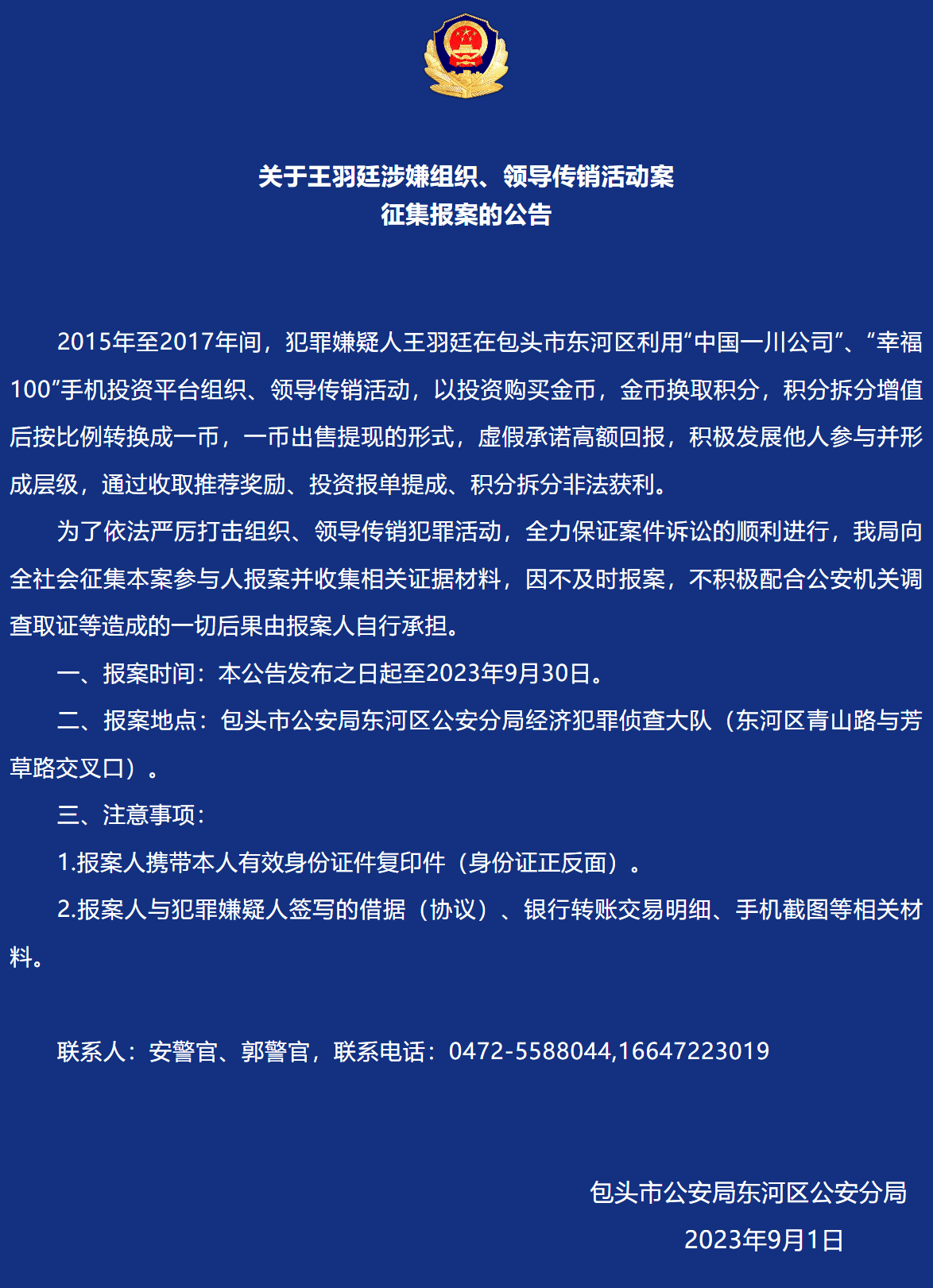 發(fā)表時(shí)間:2023-09-02 18:42作者:東河公安來源:東河公安 關(guān)于王羽廷涉嫌組織、領(lǐng)導(dǎo)傳銷活動(dòng)案征集報(bào)案的公告 2015年至2017年間,犯罪嫌疑人王羽廷在包頭市東河區(qū)利用“中國一川公司”、“幸福100”手機(jī)投資平臺(tái)組織、領(lǐng)導(dǎo)傳銷活動(dòng),以投資購買金幣,金幣換取積分,積分拆分增值后按比例轉(zhuǎn)換成一幣,一幣出售提現(xiàn)的形式,虛假承諾高額回報(bào),積極發(fā)展他人參與并形成層級(jí),通過收取推薦獎(jiǎng)勵(lì)、投資報(bào)單提成、積分拆分非法獲利。 為了依法嚴(yán)厲打擊組織、領(lǐng)導(dǎo)傳銷犯罪活動(dòng),全力保證案件訴訟的順利進(jìn)行,我局向全社會(huì)征集本案參與人報(bào)案并收集相關(guān)證據(jù)材料,因不及時(shí)報(bào)案,不積極配合公安機(jī)關(guān)調(diào)查取證等造成的一切后果由報(bào)案人自行承擔(dān)。 一、報(bào)案時(shí)間:本公告發(fā)布之日起至2023年9月30日。 二、報(bào)案地點(diǎn):包頭市公安局東河區(qū)公安分局經(jīng)濟(jì)犯罪偵查大隊(duì)(東河區(qū)青山路與芳草路交叉口)。 三、注意事項(xiàng): 1.報(bào)案人攜帶本人有效身份證件復(fù)印件(身份證正反面)。 2.報(bào)案人與犯罪嫌疑人簽寫的借據(jù)(協(xié)議)、銀行轉(zhuǎn)賬交易明細(xì)、手機(jī)截圖等相關(guān)材料。 聯(lián)系人:安警官、郭警官 包頭市公安局東河區(qū)公安分局 2023年9月1日