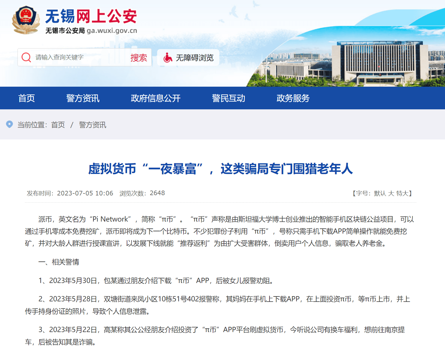 第一個今年7月25日,無錫公安官網(wǎng)上發(fā)布了一篇題為“虛擬貨幣‘一夜暴富’這類騙局專門圍獵老年人”里面提到,不少犯罪分子利用“派幣”,號稱只要手機(jī)下載APP簡單操作就能免費(fèi)挖礦,并對大齡人群進(jìn)行授課宣講,以發(fā)展下線就能推薦返利為由擴(kuò)大受害群體,倒賣用戶個人信息,騙取老人養(yǎng)老金。