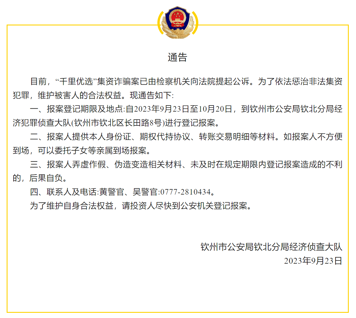 目前,“千里優(yōu)選”集資詐騙案已由檢察機關向法院提起公訴。為了依法懲治非法集資犯罪,維護被害人的合法權益。現(xiàn)通告如下:
