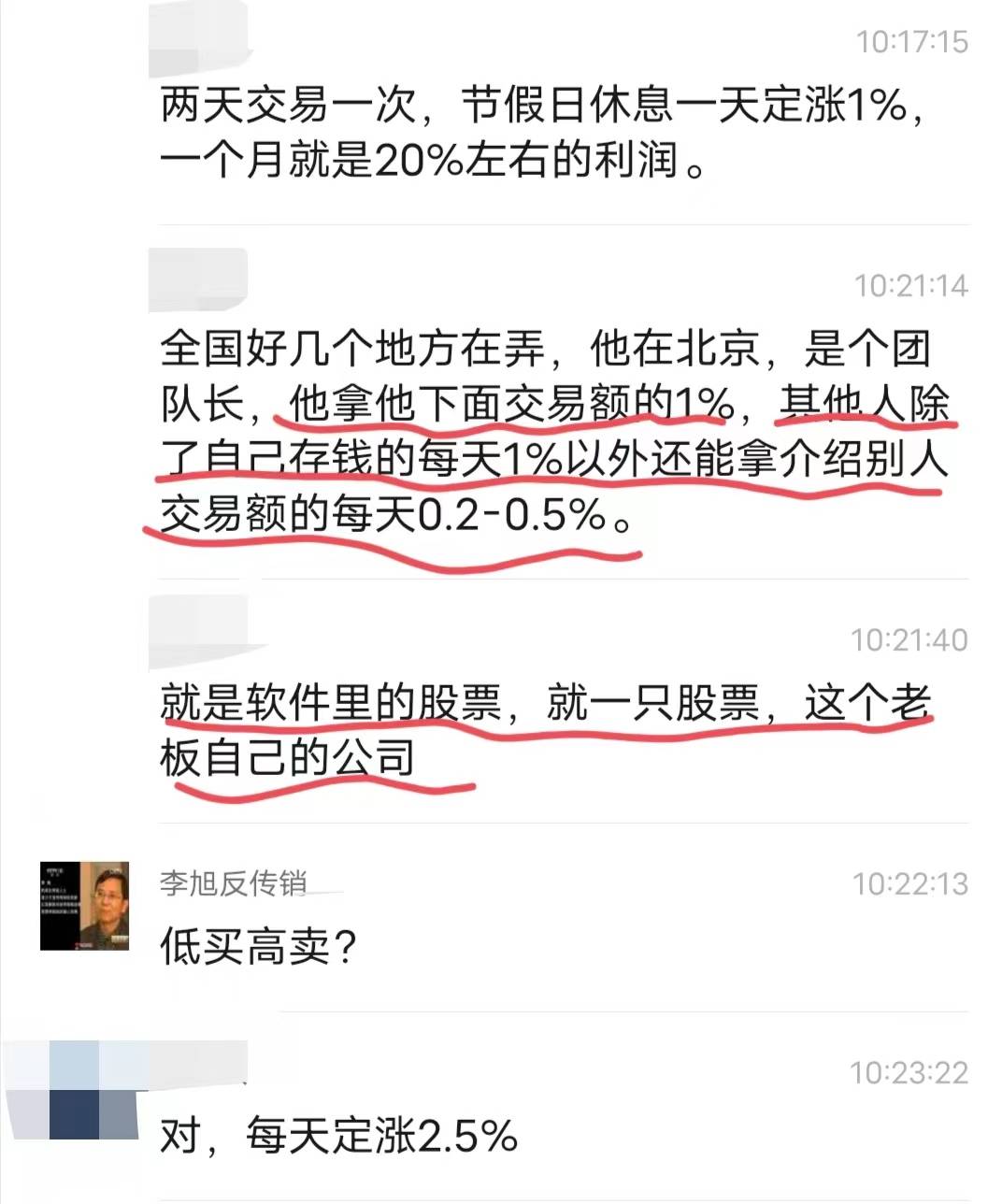 陳先生稱,自己從4月2日開(kāi)始在該軟件上進(jìn)行交易,股票已經(jīng)從48元漲到119元了。而自己的朋友就是一個(gè)小團(tuán)長(zhǎng),一個(gè)月就有20%左右的利潤(rùn)。 “茁某”公司還聲稱,這些利潤(rùn)全部來(lái)源于市場(chǎng),利潤(rùn)從每日增長(zhǎng)2.5%的市值里進(jìn)行撥比。