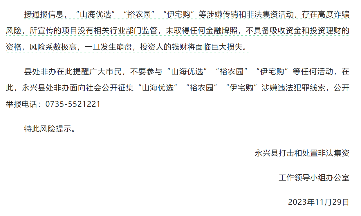 縣處非辦在此提醒廣大市民,不要參與“山海優(yōu)選”“裕農(nóng)園”“伊宅購”等任何活動(dòng),在此,永興縣處非辦面向社會(huì)公開征集“山海優(yōu)選”“裕農(nóng)園”“伊宅購”涉嫌違法犯罪線索。