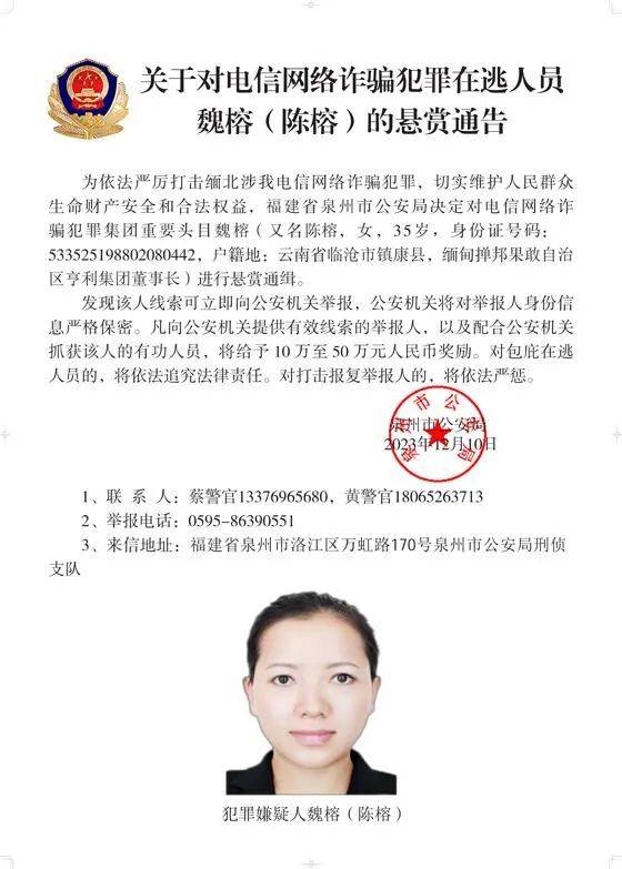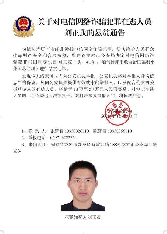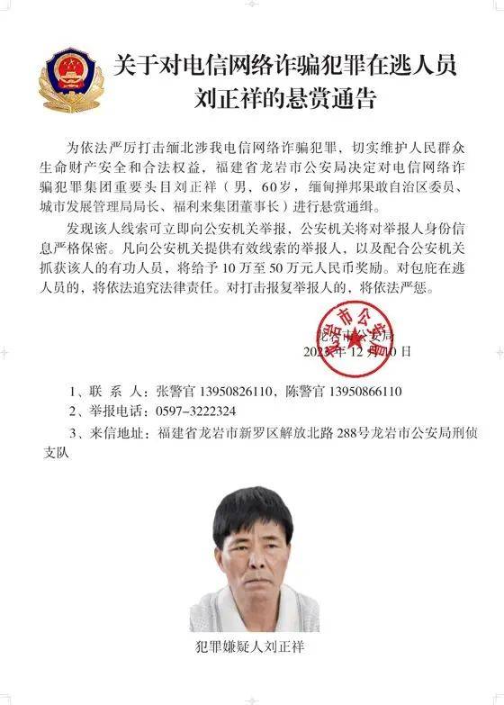 為依法嚴厲打擊緬北涉我電信網(wǎng)絡(luò)詐騙犯罪,切實維護人民群眾生命財產(chǎn)安全和合法權(quán)益,遼寧省大連市公安局決定對白所成、白應(yīng)蒼(又名李云晨)、白應(yīng)蘭(又名李夢娜)進行公開懸賞通緝;福建省泉州市公安局決定對魏懷仁、魏榕(又名陳榕)、魏青松(又名楊松)進行公開懸賞通緝;福建省龍巖市公安局決定對劉正祥、劉積光(又名李華光)、劉正茂進行公開懸賞通緝;重慶市公安局決定對徐老發(fā)(又名徐發(fā)啟)進行公開懸賞通緝。
