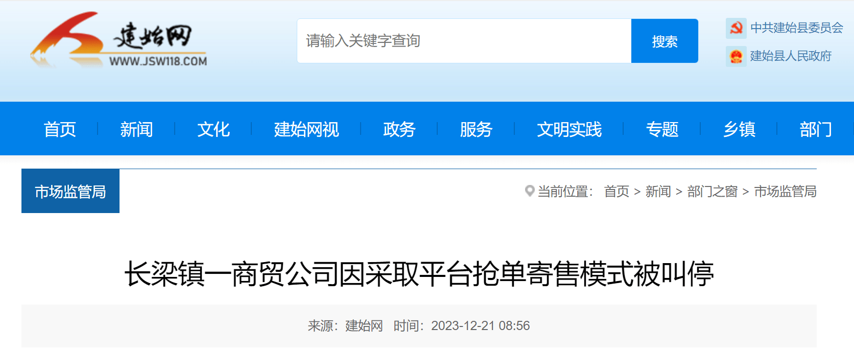 長梁鎮(zhèn)一商貿(mào)公司因采取平臺搶單寄售模式被叫停