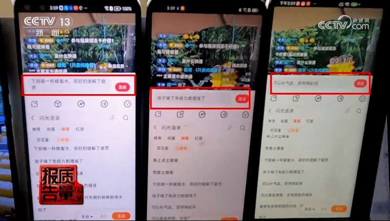 這個(gè)賣土蜂蜜的直播間,連續(xù)一排監(jiān)控手機(jī)的互動(dòng)框里,一條條互動(dòng)好評(píng)正蓄勢待發(fā),“下班喝一杯蜂蜜水,很好緩解了疲勞”“孩子喝了免疫力都增強(qiáng)了”“可以補(bǔ)氣血,堅(jiān)持喝起來”等等,這些有聲有色,會(huì)有生活場景的評(píng)論,看起來讓人覺得情真一切。