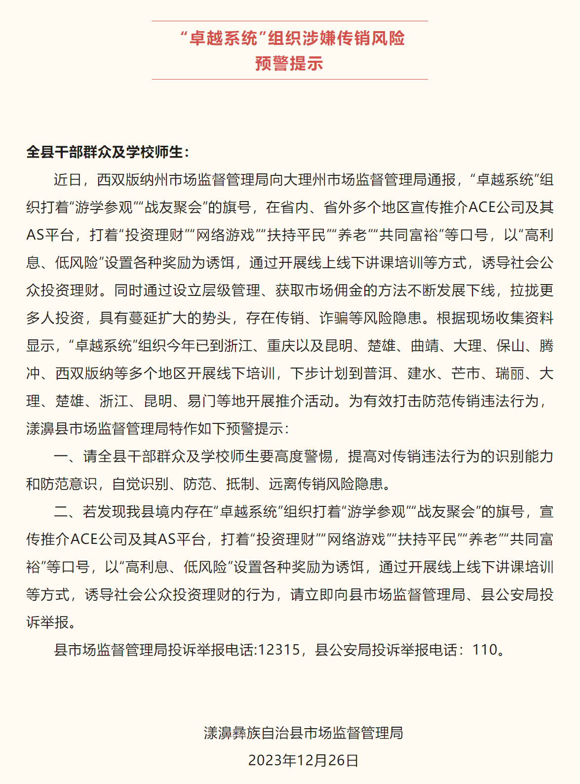 漾濞市監(jiān)局:“卓越系統(tǒng)”組織涉嫌傳銷風險預警提示