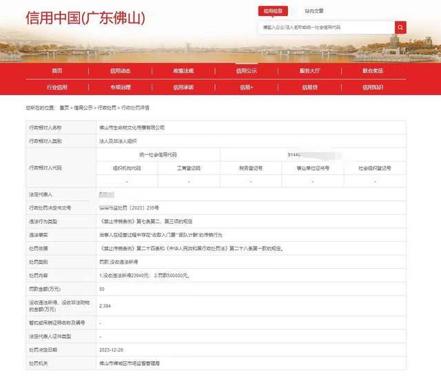 廣州日報記者從信用中國(廣東佛山)網(wǎng)站獲悉,根據(jù)《禁止傳銷條例》第七條第二、第三項的規(guī)定,佛山市禪城區(qū)市場監(jiān)督管理局近日對佛山市生命樹文化傳播有限公司進行違法處罰,處罰內(nèi)容包括:沒收該公司違法所得23940元,罰款500000元。