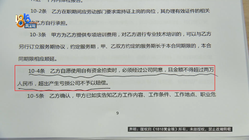 合同里有這么一條,乙方也就是員工,自愿使用自有資金拍賣時(shí),必須經(jīng)過公司同意,且金額不得超過兩萬(wàn)元人民幣,超出產(chǎn)生虧損,公司不予以賠償。
