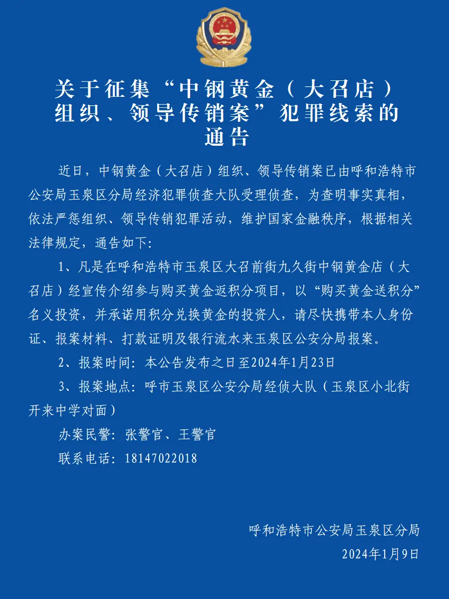 1月9日,呼和浩特市公安局玉泉區(qū)分局發(fā)布通告,征集“中鋼黃金(大召店 )組織、領(lǐng)導(dǎo)傳銷(xiāo)案犯罪線案。