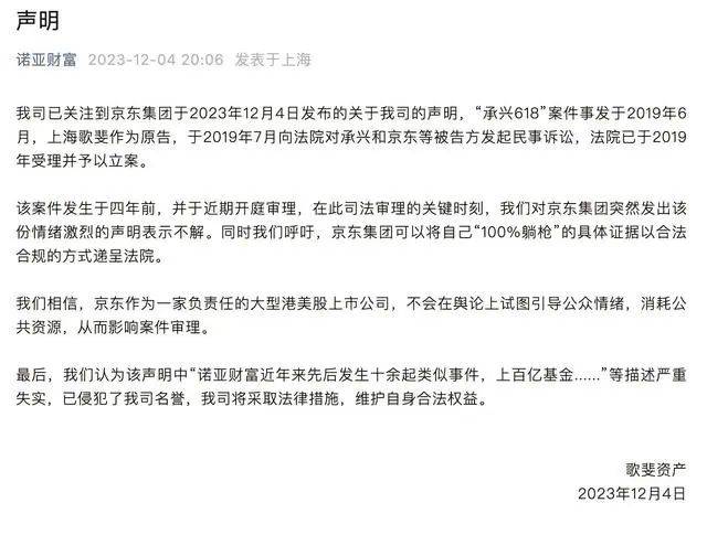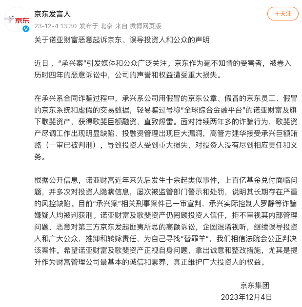 據(jù)每經(jīng)網(wǎng)此前報道,針對此前諾亞財富起訴求京東連帶賠償35億元一案,2023年12月4日,京東發(fā)言人官微發(fā)布聲明稱,“承興案”中,京東作為毫不知情的受害者,被卷入歷時四年的惡意訴訟中,公司的聲譽和權(quán)益遭受重大損失。