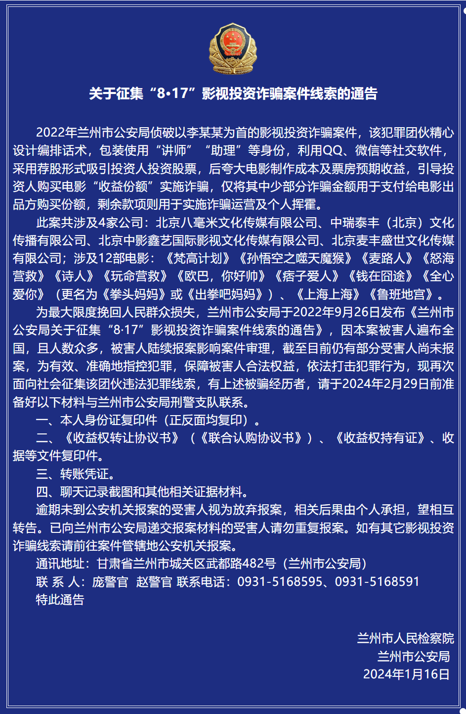 發(fā)表時間:2024-01-23 21:52作者:蘭州公安來源:蘭州公安 關(guān)于征集“8·17”影視投資詐騙案件線索的通告 2022年蘭州市公安局偵破以李某某為首的影視投資詐騙案件,該犯罪團伙精心設(shè)計編排話術(shù),包裝使用“講師”“助理”等身份,利用QQ、微信等社交軟件,采用薦股形式吸引投資人投資股票,后夸大電影制作成本及票房預(yù)期收益,引導(dǎo)投資人購買電影“收益份額”實施詐騙,僅將其中少部分詐騙金額用于支付給電影出品方購買份額,剩余款項則用于實施詐騙運營及個人揮霍。 此案共涉及4家公司:北京八毫米文化傳媒有限公司、中瑞泰豐(北京)文化傳播有限公司、北京中影鑫藝國際影視文化傳媒有限公司、北京麥豐盛世文化傳媒有限公司;涉及12部電影:《梵高計劃》《孫悟空之噬天魔猴》《麥路人》《怒海營救》《詩人》《玩命營救》《歐巴,你好帥》《痞子愛人》《錢在囧途》《全心愛你》(更名為《拳頭媽媽》或《出拳吧媽媽》)、《上海上?!贰遏敯嗟貙m》。 為最大限度挽回人民群眾損失,蘭州市公安局于2022年9月26日發(fā)布《蘭州市公安局關(guān)于征集“8·17”影視投資詐騙案件線索的通告》,因本案被害人遍布全國,且人數(shù)眾多,被害人陸續(xù)報案影響案件審理,截至目前仍有部分受害人尚未報案,為有效、準(zhǔn)確地指控犯罪,保障被害人合法權(quán)益,依法打擊犯罪行為,現(xiàn)再次面向社會征集該團伙違法犯罪線索,有上述被騙經(jīng)歷者,請于2024年2月29日前準(zhǔn)備好以下材料與蘭州市公安局刑警支隊聯(lián)系。 一、本人身份證復(fù)印件(正反面均復(fù)?。?/p> 二、《收益權(quán)轉(zhuǎn)讓協(xié)議書》(《聯(lián)合認購協(xié)議書》)、《收益權(quán)持有證》、收據(jù)等文件復(fù)印件。 三、轉(zhuǎn)賬憑證。 四、聊天記錄截圖和其他相關(guān)證據(jù)材料。 逾期未到公安機關(guān)報案的受害人視為放棄報案,相關(guān)后果由個人承擔(dān),望相互轉(zhuǎn)告。已向蘭州市公安局遞交報案材料的受害人請勿重復(fù)報案。如有其它影視投資詐騙線索請前往案件管轄地公安機關(guān)報案。 通訊地址:甘肅省蘭州市城關(guān)區(qū)武都路482號(蘭州市公安局) 聯(lián) 系 人:龐警官 趙警官 特此通告 蘭州市人民檢察院 蘭州市公安局 2024年1月16日