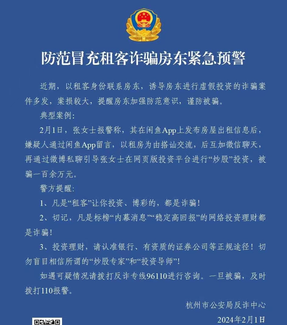 2月1日,杭州市公安局反詐中心發(fā)布一則《防范冒充租客詐騙房東緊急預(yù)警》。近期以租客身份聯(lián)系房東,誘導(dǎo)房東進(jìn)行虛假投資的詐騙案件多發(fā),案損較大,提醒房東加強(qiáng)防范意識(shí),謹(jǐn)防被騙。