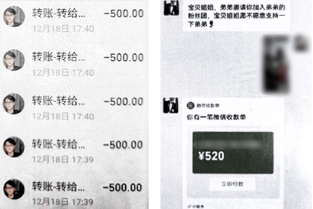 從2022年2月開始,張阿姨就在群里不斷給一個叫“靳東”的用戶充值打賞,不久后“靳東”就以談戀愛的名義加上了張阿姨的微信。張先生提供的聊天記錄中能找到許多“老婆”“我會娶你”“我想你了”等字眼。而張阿姨也在“偶像”一聲聲甜蜜的“寶貝”中逐漸淪陷,以至于到案發(fā),張阿姨仍不相信網(wǎng)絡(luò)上那個溫柔體貼的帥氣男星會是兒子口中的“詐騙犯”......