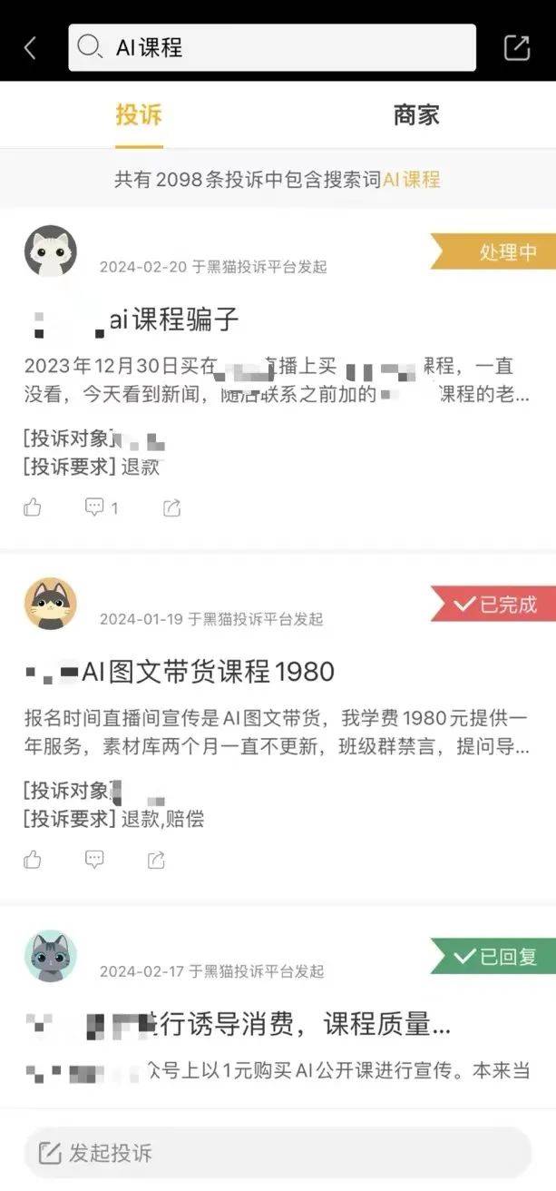 △黑貓平臺關(guān)于AI課程的投訴