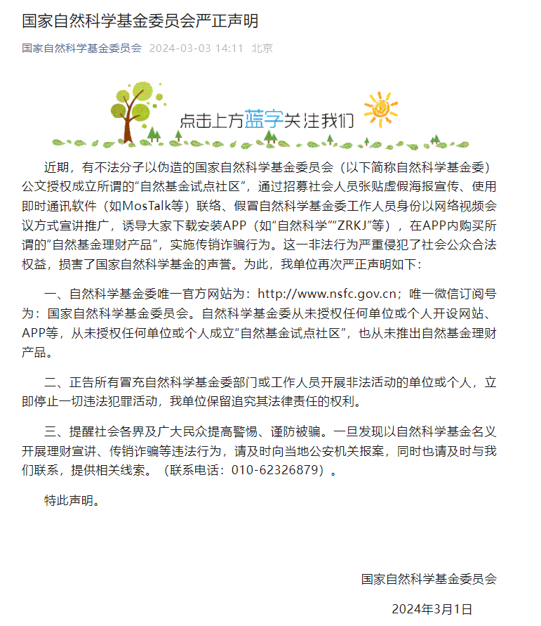 自然科學(xué)基金委:有不法分子偽造公文、誘導(dǎo)下載APP實(shí)施傳銷詐騙