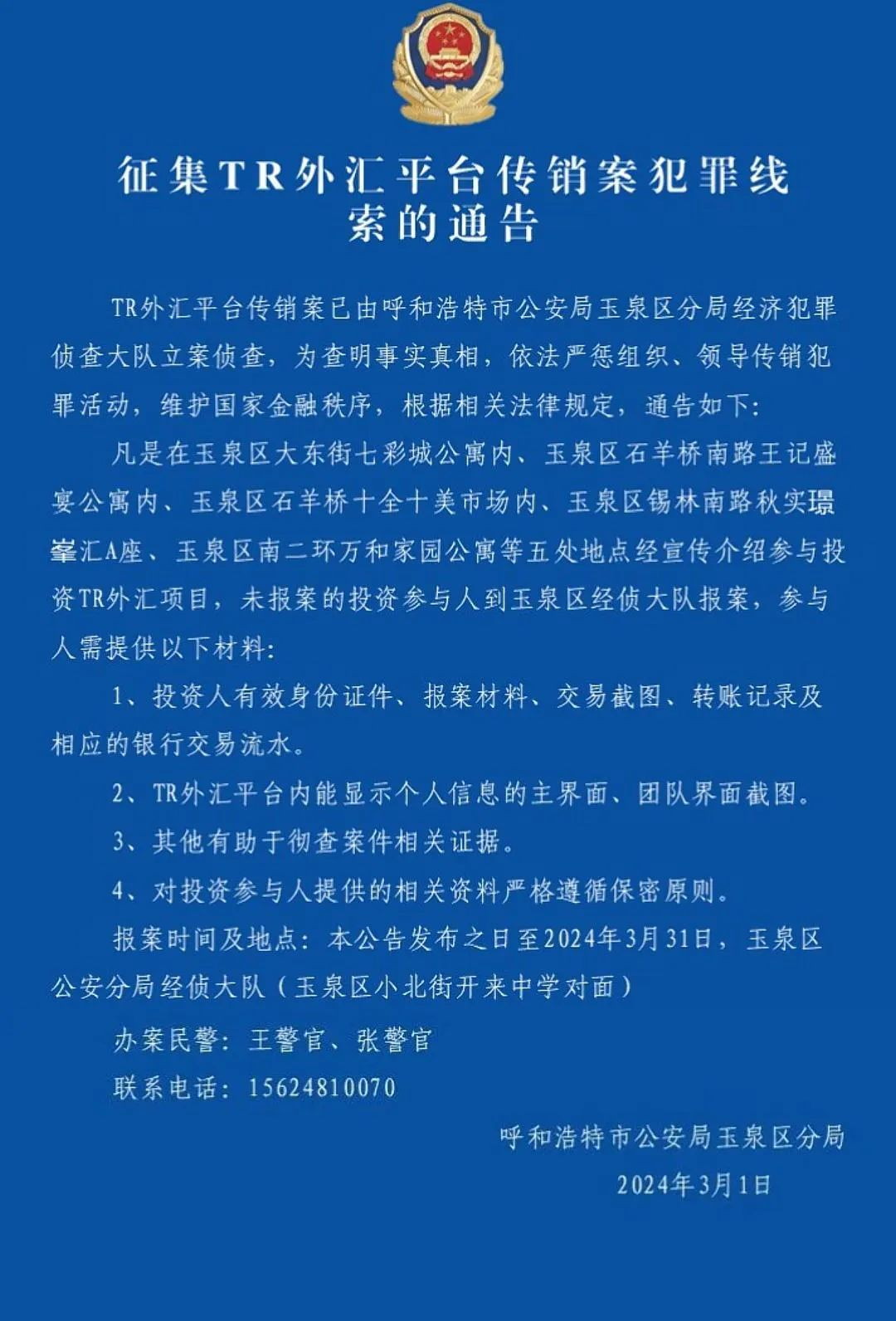 呼和浩特警方:征集TR外匯平臺傳銷案犯罪線索的通告
