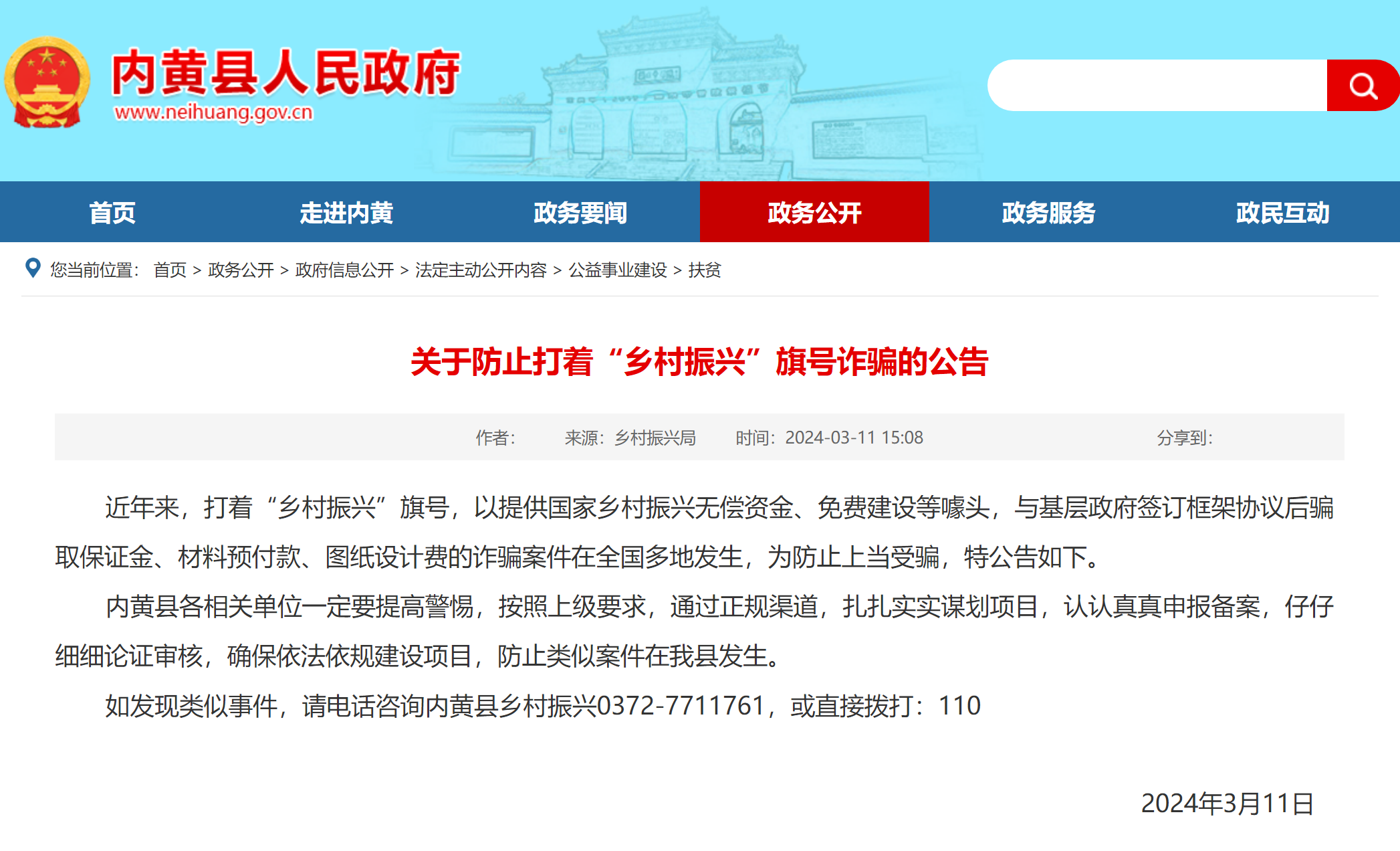 如發(fā)現(xiàn)類似事件,請(qǐng)電話咨詢內(nèi)黃縣鄉(xiāng)村振興0372-7711761,或直接撥打:110
