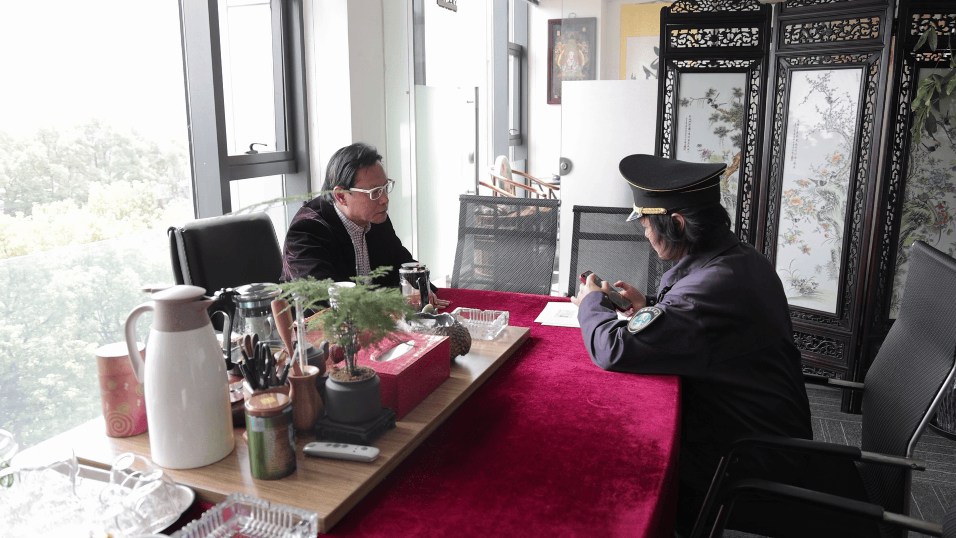 九亭鎮(zhèn)市場(chǎng)監(jiān)督管理所工作人員約談芯灸片開創(chuàng)者、芯加波生物負(fù)責(zé)人楊仁貴。澎湃新聞?dòng)浾?鄒橋 攝