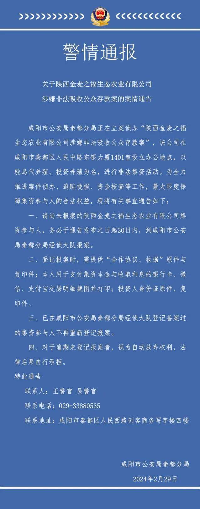 目前,秦都公安已先后抓獲該團伙5名犯罪嫌疑人,并于2月29日向社會發(fā)布《關于陜西金麥之福生態(tài)農(nóng)業(yè)有限公司涉嫌非法吸收公眾存款案的案情通告》,提醒受騙群眾盡快報案。