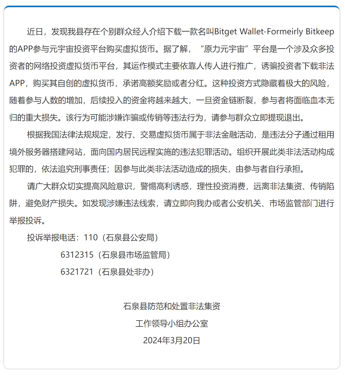 近日,發(fā)現(xiàn)我縣存在個別群眾經(jīng)人介紹下載一款名叫Bitget Wallet-Formeirly Bitkeep的APP參與元宇宙投資平臺購買虛擬貨幣。據(jù)了解,“原力元宇宙”平臺是一個涉及眾多投資者的網(wǎng)絡(luò)投資虛擬貨幣平臺,其運作模式主要依靠人傳人進行推廣,誘騙投資者下載非法APP,購買其自創(chuàng)的虛擬貨幣,承諾高額獎勵或者分紅。