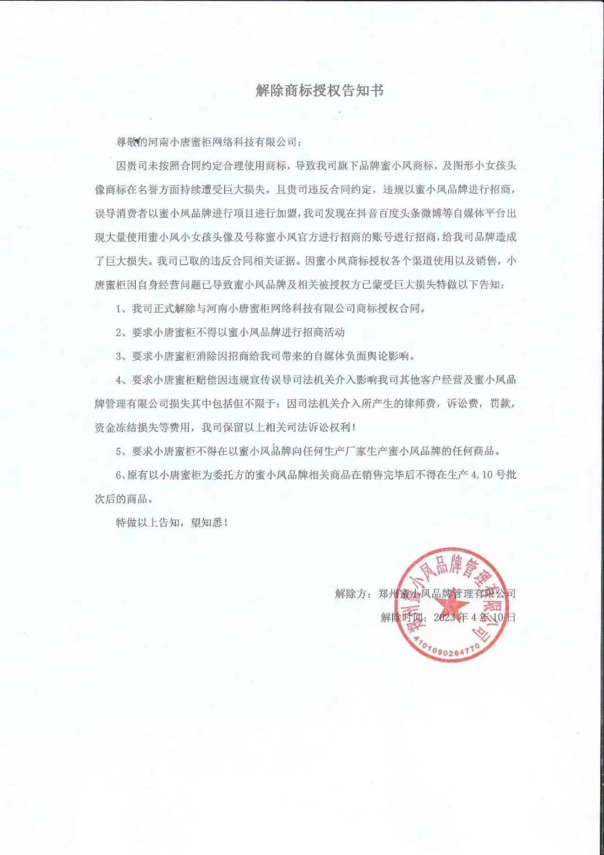 2023年4月18日,蜜小鳳品牌管理有限公司發(fā)布《解除商標授權告知書》緊急通知。