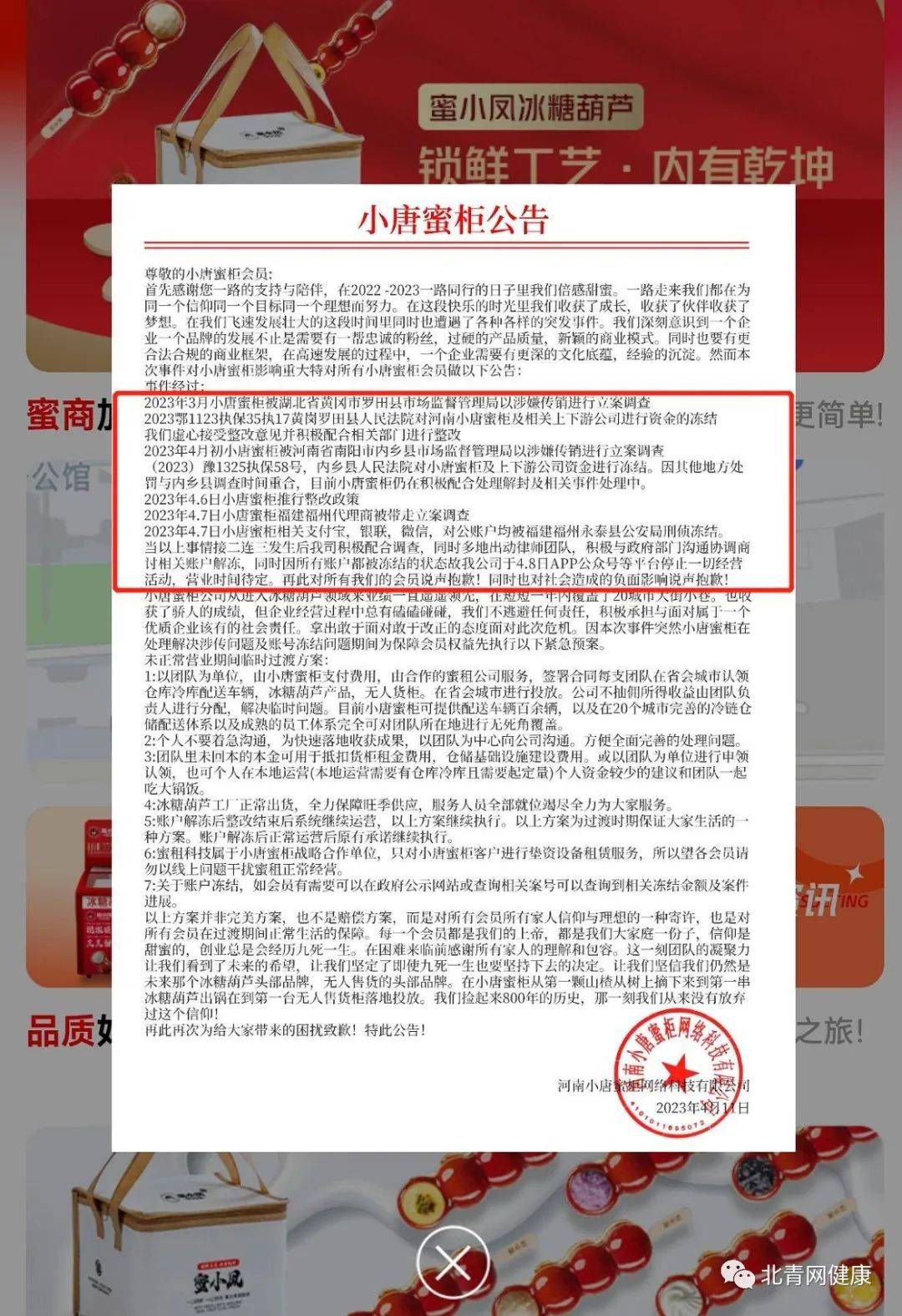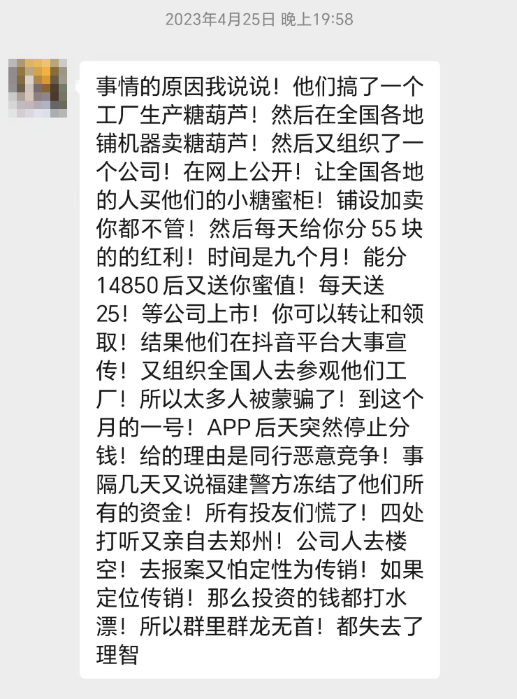 到2023年4月25,就又有了另一位網友跟我們反饋:他通過某短視頻直播間參與小唐蜜柜,項目突然停止運作,該網友描述,小唐蜜柜公司一會說是同行惡意競爭,一會又說公司賬戶被警方凍結,他們去鄭州公司,發(fā)現(xiàn)公司已經人去樓空,去報案又怕定性為傳銷,投資的錢都打水漂,不知道該怎么辦,希望給建議。