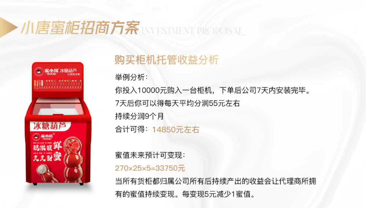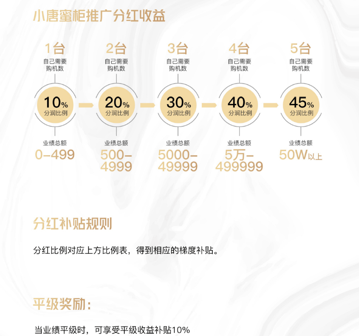 動態(tài)推廣分紅收益:認購一臺“小唐蜜柜”就可獲得分潤比例10%,購買兩臺柜機可獲得分潤比例20%。依次類推,最高購買5臺柜機可獲分潤比例45%。同時,“小唐蜜柜”還有合伙人制度,即出資20萬元可代理一個區(qū)或縣,每追加20萬再多代理一個區(qū)或縣。合伙人每推薦一個建倉合伙人,即形成蜜柜長與蜜柜員的關系時,可得0.1元/只的合伙人差價獎勵以及5元/臺的合伙人租賃獎勵,推廣越多,收益就越多。當蜜柜員與蜜柜長業(yè)績平級時,可享受平級收益補貼10%。