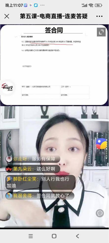2580元的價(jià)格讓杜紅義有點(diǎn)兒猶豫,讓她下定決心報(bào)名的原因是王晶老師在直播間為學(xué)員們打的包票。據(jù)杜紅義提供的課程直播錄像顯示,主講人王晶老師為在線學(xué)員展示了一份合同,聲稱交付2580元之后,雙方會(huì)簽訂一份合同,保證簽約學(xué)員的短視頻平臺(tái)賬號(hào)21天內(nèi)達(dá)到1000粉絲,并且有收益,達(dá)不到可以全額退款。