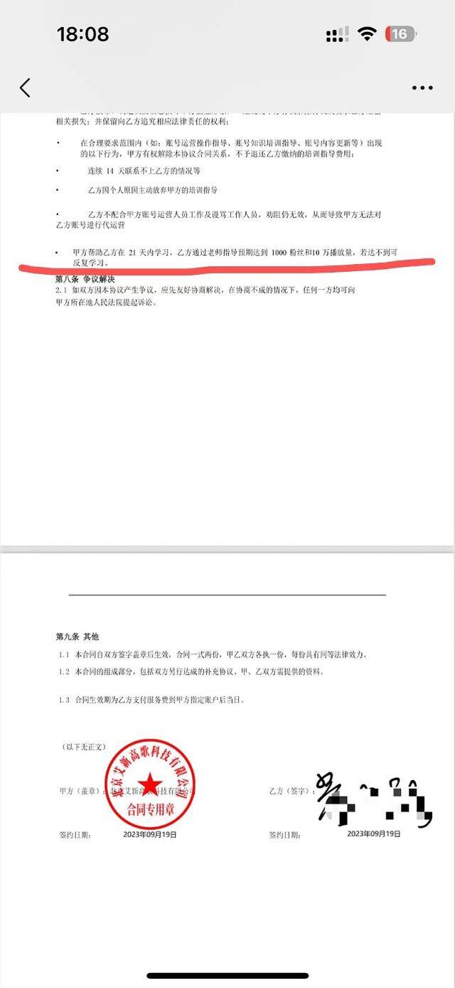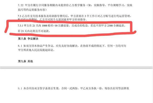 而這版合同中的退費(fèi)內(nèi)容又改為了:“甲方幫助乙方在21天內(nèi)學(xué)習(xí),乙方通過(guò)老師指導(dǎo)預(yù)期達(dá)到1000粉絲和10萬(wàn)播放量,若達(dá)不到可反復(fù)學(xué)習(xí)”。