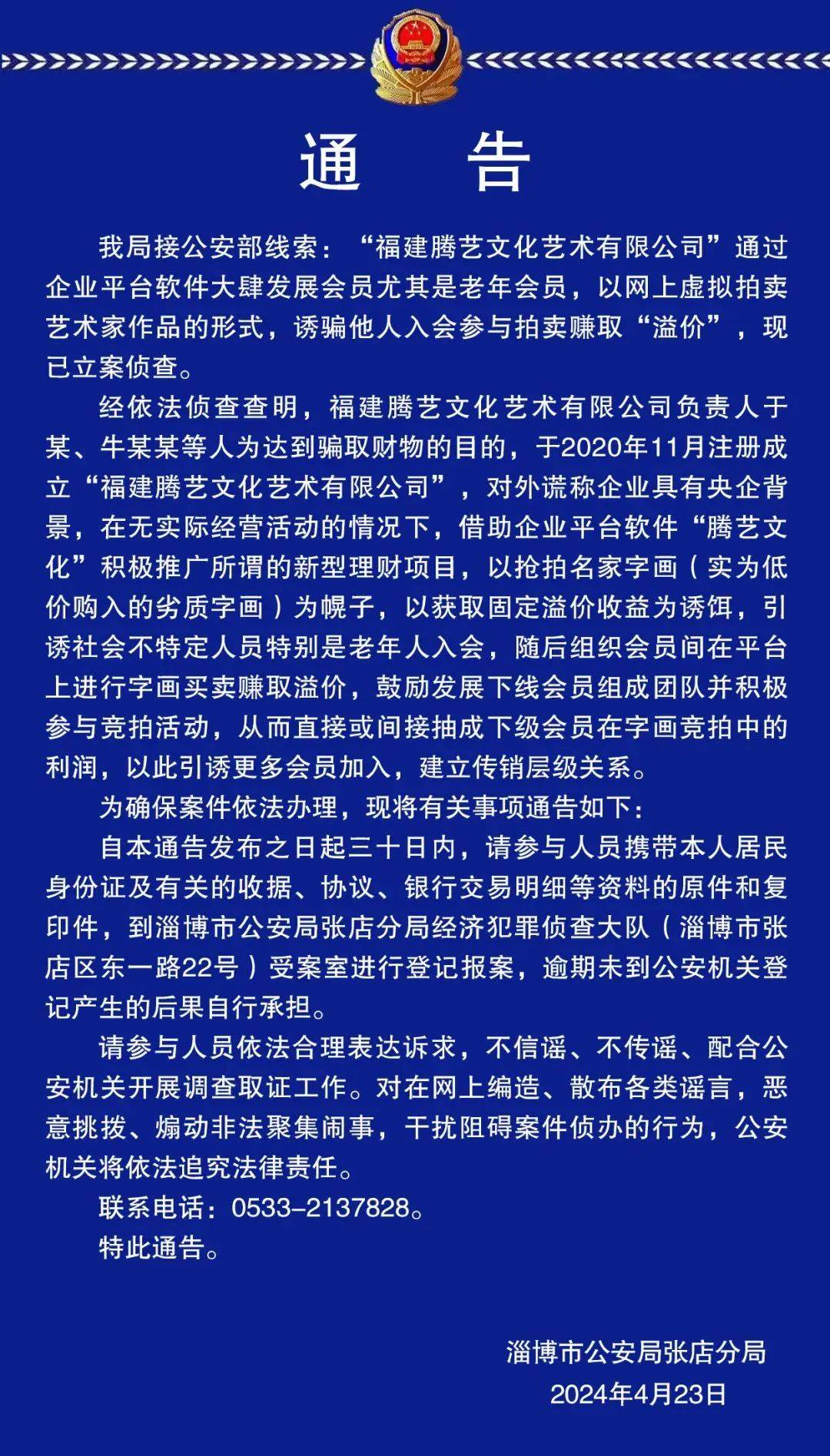淄博市公安局張店分局關(guān)于偵辦“福建騰藝文化藝術(shù)有限公司”涉嫌組織、領(lǐng)導(dǎo)傳銷活動(dòng)案有關(guān)事項(xiàng)的通告