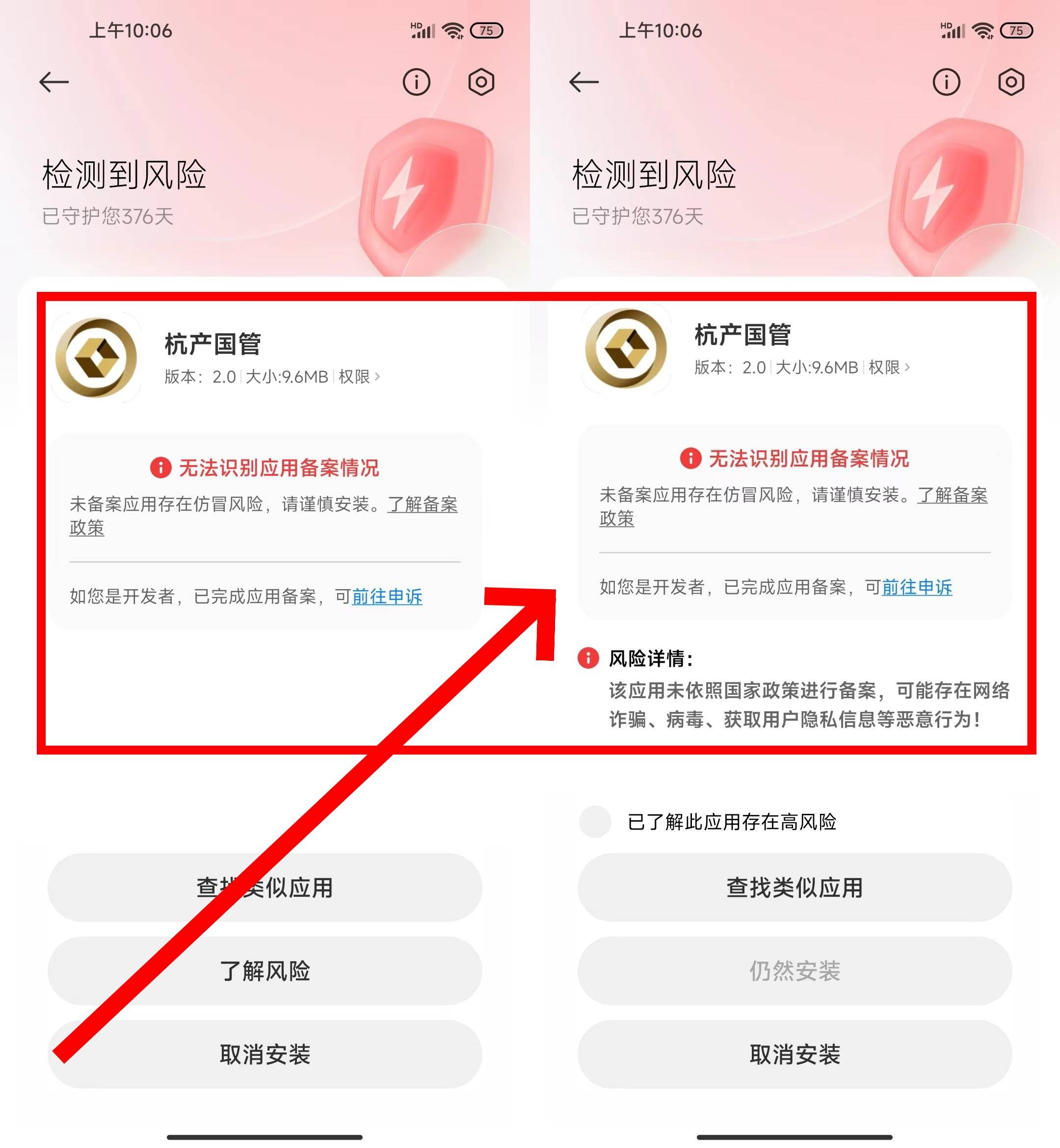 下載安裝時提示:該應用未依照國家政策進行備案,可能存在網(wǎng)絡詐騙、病毒、獲取用戶隱私信息等惡意行為!