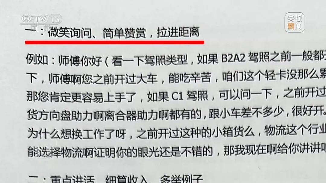 這是一份所謂物流公司的話術(shù)本,在面試環(huán)節(jié),上面寫著:上來要微笑詢問、簡單贊賞、拉近距離。在司機最在意的收入問題上,話術(shù)中提醒:要重點講活、細(xì)算收入、多舉例子。再看這收入計算公式,確實很詳盡。