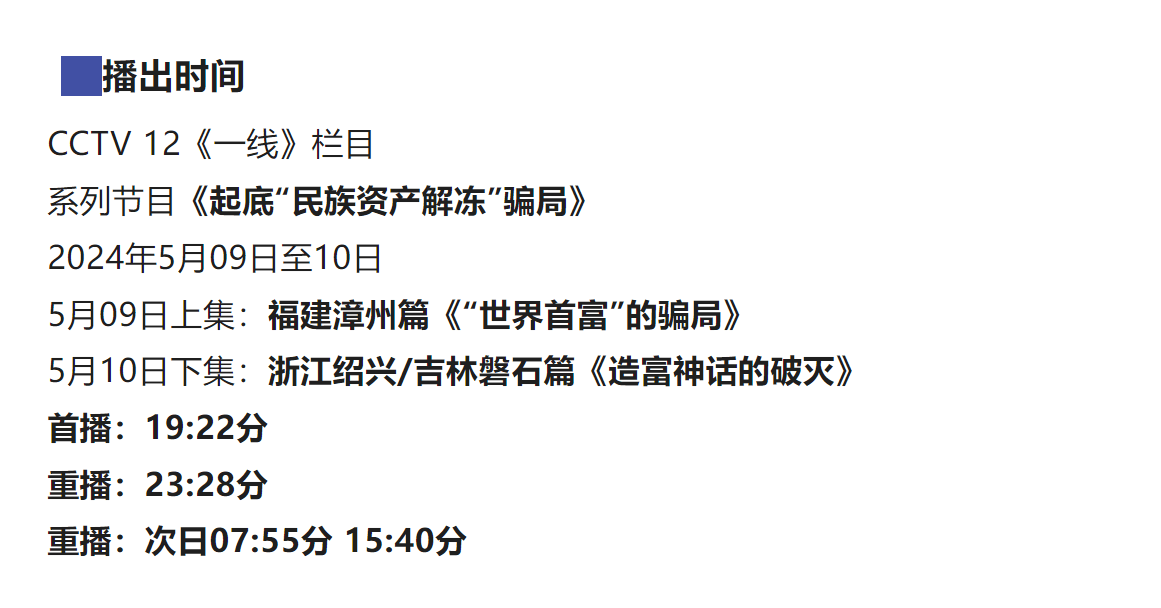 重磅來襲!《起底“民族資產(chǎn)解凍”騙局》系列節(jié)目 即將播出