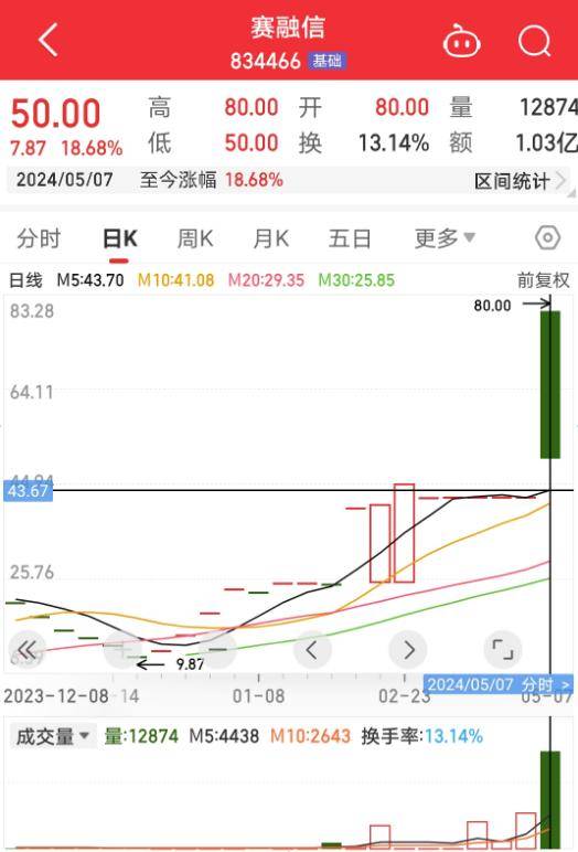 圖片來源:同花順APP截圖 例如,5月7日當(dāng)天,賽融信成交量達(dá)到了1.287萬手,成交額為1.03億元,對(duì)應(yīng)平均每股成交價(jià)格為80元/股,而當(dāng)天該股的最高價(jià)正好為80元/股。根據(jù)5月8日賽融信公告,瑞豐達(dá)、江蘇瑞竹旗下的兩只產(chǎn)品在5月7日通過競(jìng)價(jià)交易的方式合計(jì)買入了賽融信84.5萬股。由此可以推測(cè),瑞豐達(dá)及關(guān)聯(lián)方旗下的多只產(chǎn)品在5月7日當(dāng)天以80元/股的高價(jià)大量買入賽融信。 一新三板分析人士向記者指出,新三板掛牌個(gè)股一天之內(nèi)成交額過億的情況都比較特殊,除了一些國企的股份劃轉(zhuǎn),“我印象中幾乎很少有這樣的情形”。 類似的現(xiàn)象也發(fā)生在和嘉天健、農(nóng)匠科技。5月7日當(dāng)天,和嘉天健、農(nóng)匠科技成交金額分為高達(dá)4384萬元、3206萬元,同樣都是歷史天量。 另外,這些個(gè)股目前的掛牌價(jià)格都處于歷史高位。賽融信、和嘉天健、農(nóng)匠科技、味福記自去年下半年以來,股價(jià)都出現(xiàn)了巨大的漲幅。其中,農(nóng)匠科技股價(jià)從0.14元/股升至60元/股,賽融信從0.2元/股升至50元/股。
