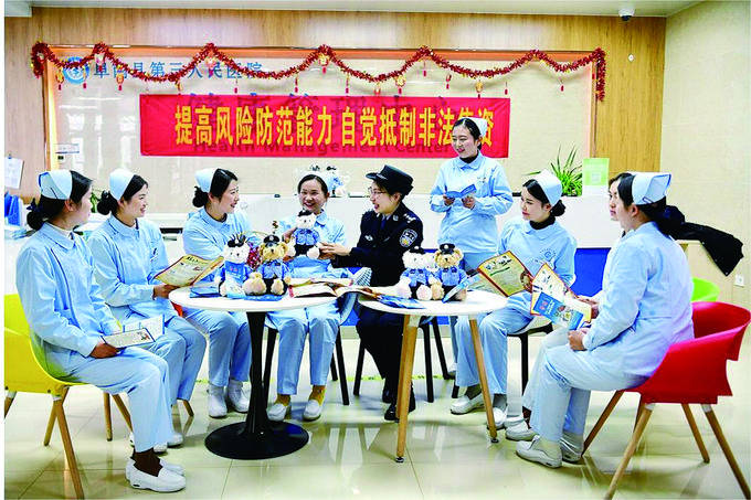 3月7日,安徽省阜南縣公安局經(jīng)偵民警在轄區(qū)醫(yī)院向護士講解防范非法集資知識。(資料圖片)