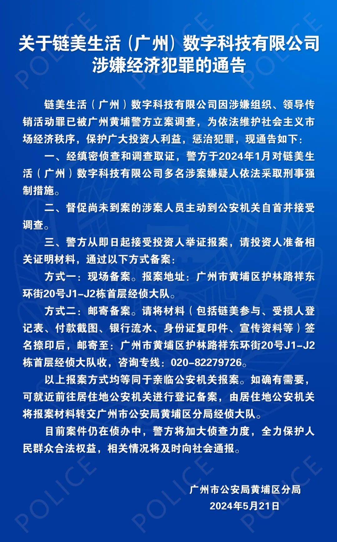 鏈美生活(廣州)數(shù)字科技有限公司因涉嫌組織、領導傳銷活動罪已被廣州黃埔警方立案調查,為依法維護社會主義市場經濟秩序,保護廣大投資人利益,懲治犯罪,現(xiàn)通告如下: