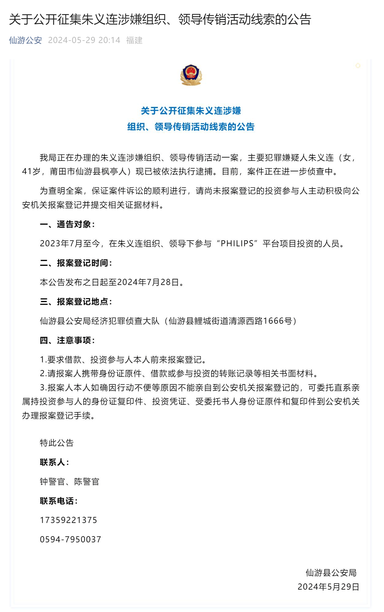 仙游公安:關(guān)于公開征集朱義連涉嫌組織、領(lǐng)導(dǎo)傳銷活動線索的公告