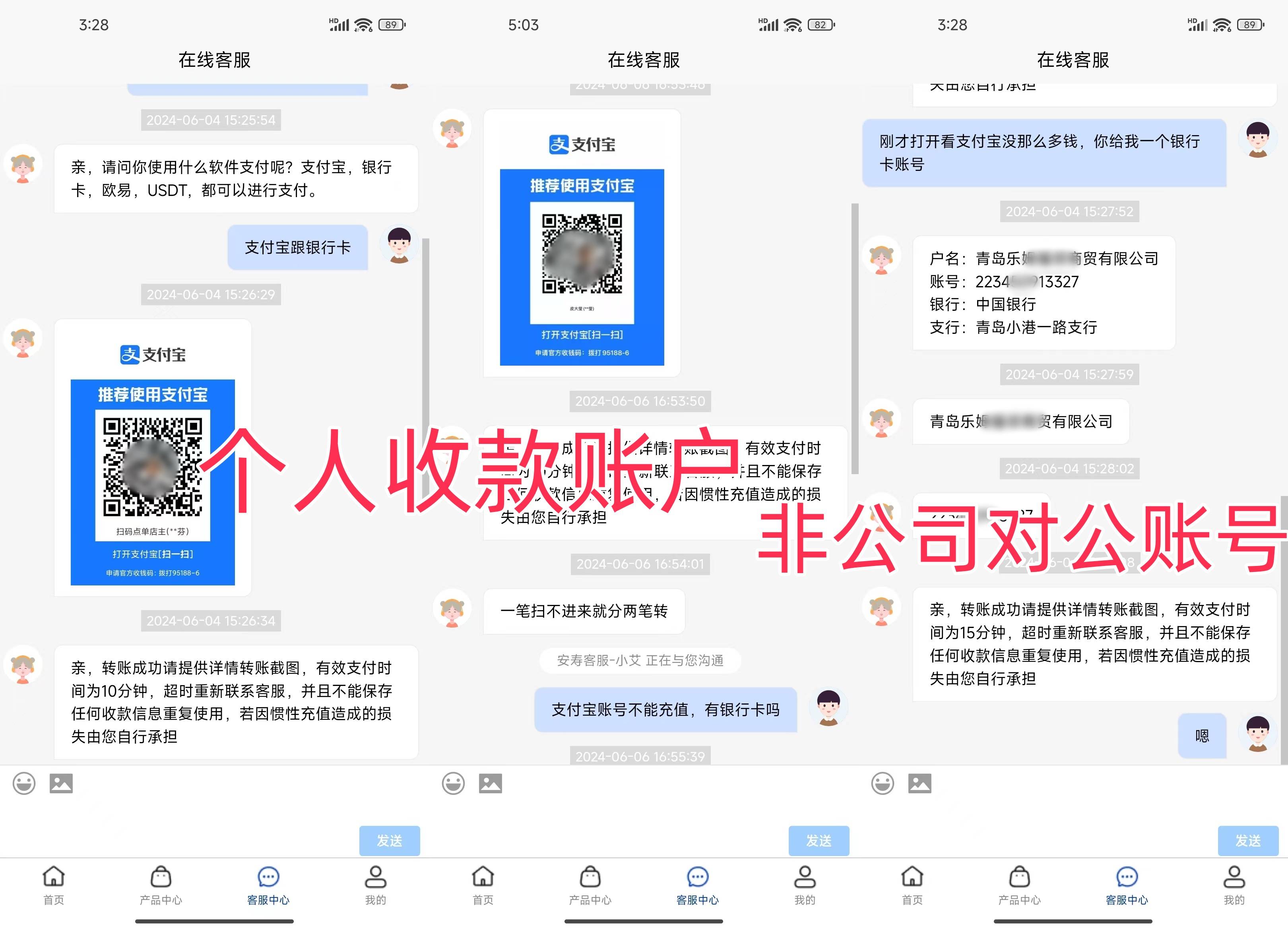 接下來,根據(jù)提示進行充值時,充值賬號必須要有“客服”提供,而且提供的收款賬戶不是“安壽集團”的對公賬戶,而是個人賬戶與其他公司的賬戶,現(xiàn)在就能完全的確定,這就是一個虛假投資理財詐騙平臺。