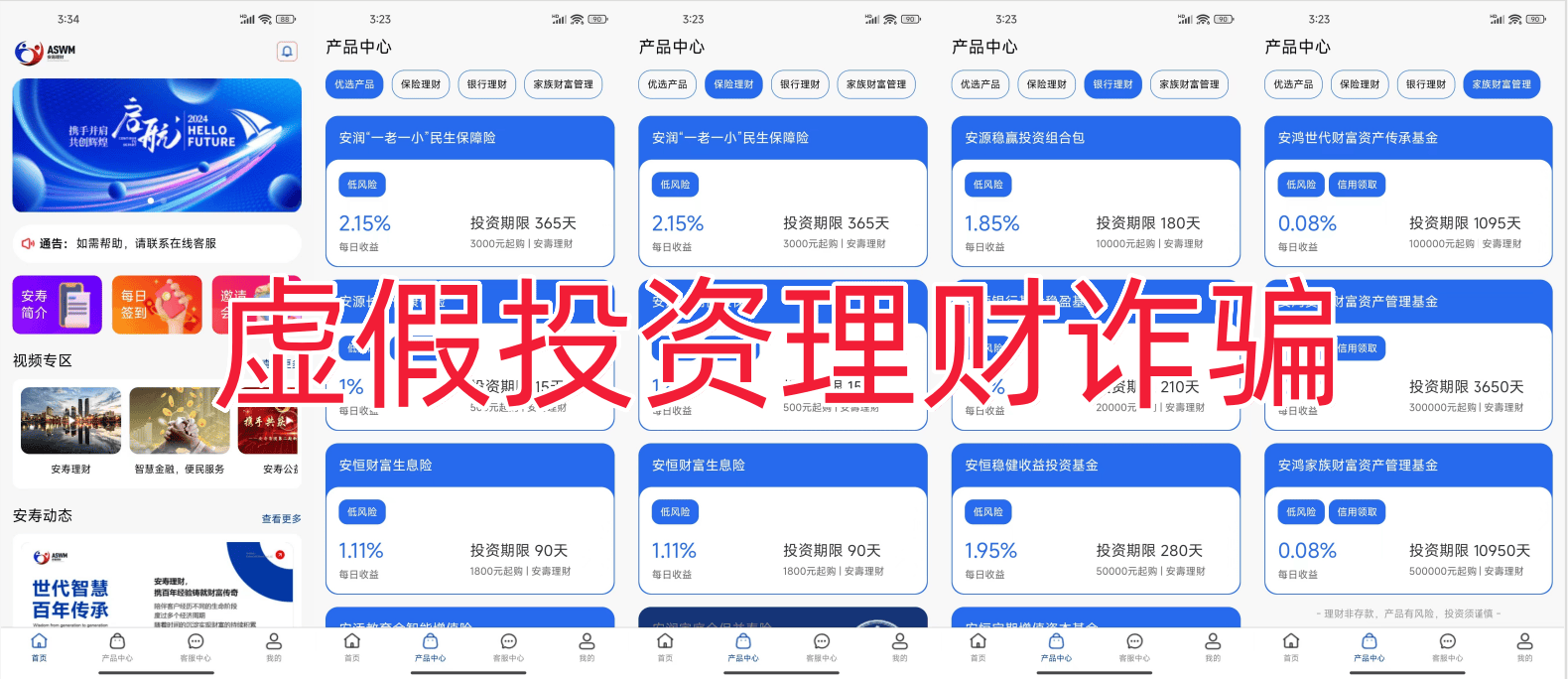 該應用平臺,以推銷虛假的超高的日收益率0.08%-2.25%保險、銀行理財產(chǎn)品。
